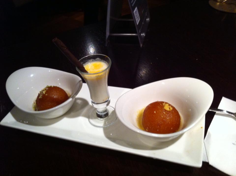 Vi började med poppadums vilka här var fyra olika versioner och serverades med de fyra tillbehören på bild av vilka mintsåsen var mest överraskande. Engelsk mintsås gillar jag inte alls men däremot indiska och den här var fenomenalt len. Min huvudrätt blev lammfärs med aubergine eftersom jag älskar båda och lamm var lite av husets specialitet. Jag blev inte besviken och det blev inte de andra heller med en vegetarisk curry och en chicken tikka masala som inte alls var så alldaglig utan med tjock sås full av härligheter och med en förvånande kick. Till efterrätt blev det för min del en gulab, de runda nästan donut-aktiga bollarna med kardemumma i kryddig varm mjölk. Mums!