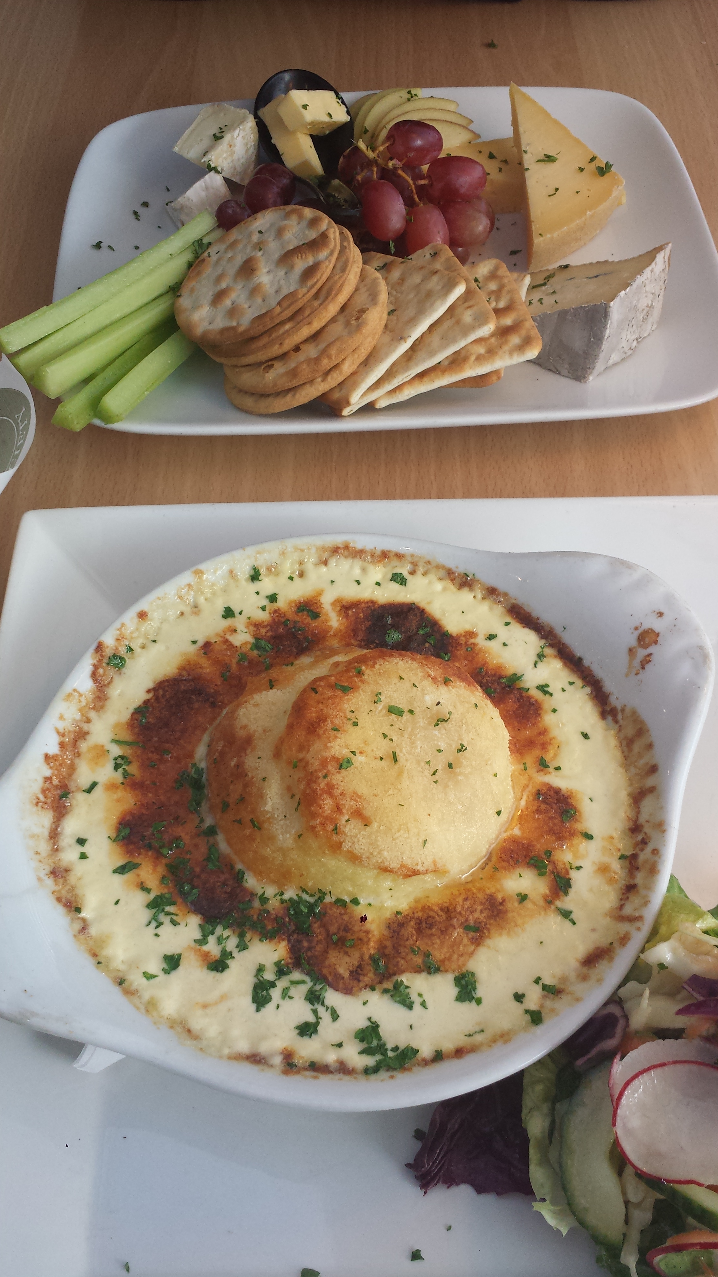 Min ostsoufflé var som ni ser fantastisk och jag skrapade ut det allra sista med sked eftersom jag inte gärna kunde slicka tallriken. Dotterns ostbricka var också fin om inte lika vågad, med några lokala ostar och några från övriga Storbritannien. Selleri i massor hade hon kanske inte behövt men det var det enda hon hade att klaga på. De har dessutom drycker som passar det mesta i ostväg även om många under lunchen valde vatten.