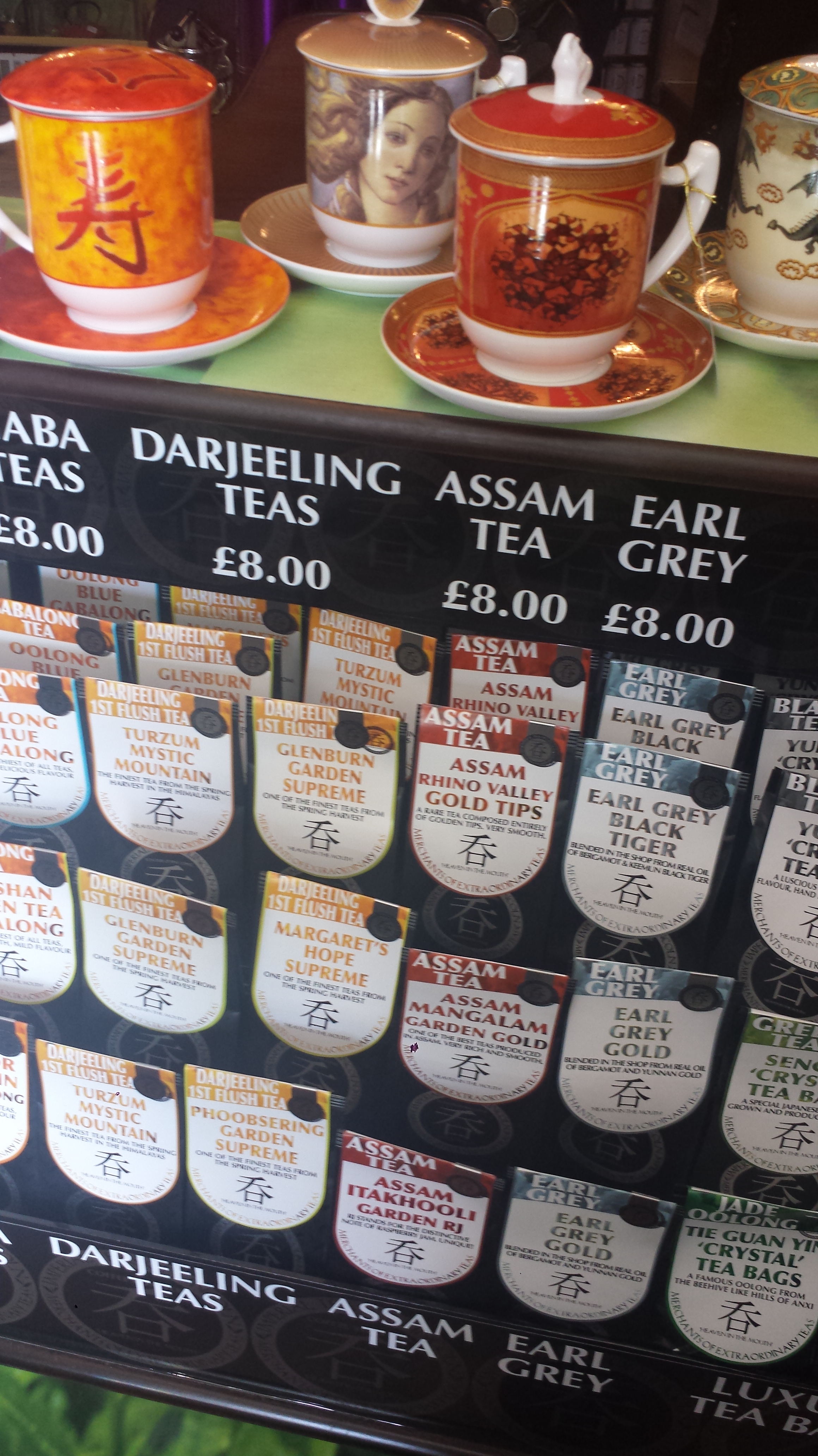 Här kan du köpa lösviktste och gärna i butikens egna, vackra burkar i lila eller grönt men annars får du det i färdigpaketerade påsar (sist köpte vi 100 gram för 9 pund vilket säger lite om prisnivån). Jag sneglade efter assamte som jag gillar men fastnade snart i en mängd andra sorter och de jag aldrig hört talas om är nästan vanligare än de jag känner till. Minsta lilla odling på Himalayas sluttningar verkar finnas representerat och gillar du kinesiskt bättre så är det inget hinder – allt paketerat i tydligt märkta förpackningar om man bara vill prova lite. Jodå, de har kaffe också men det är te som är deras specialitet och själva passionen här.