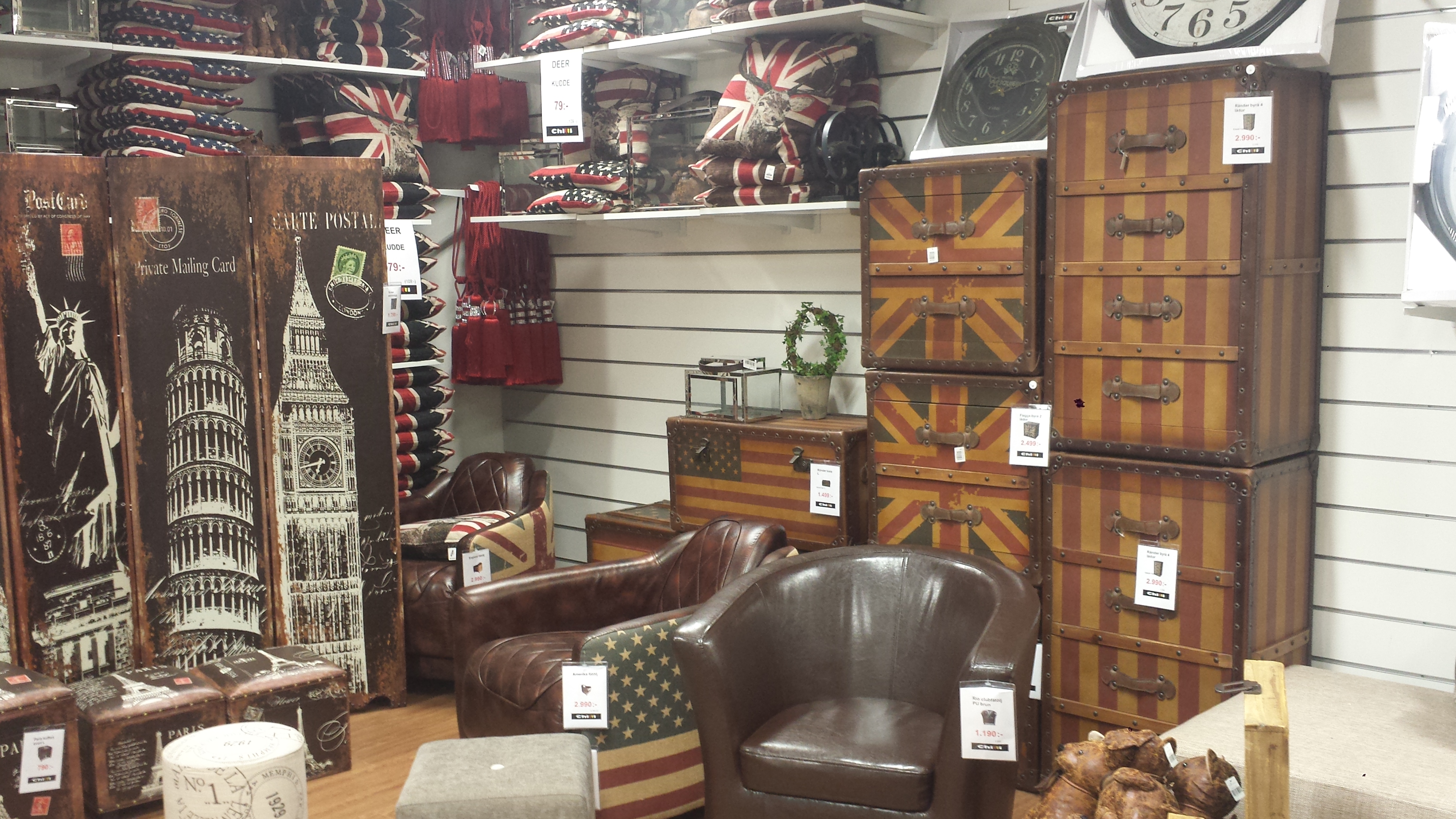 Utöver det här var det mest en bricka med jaktmotiv och nägra glas som utgjorde det anglofila i mitt rum. Jag var inte så intresserad av inredning i sig utan ville bara visa min personlighet men det drällde inte av brittiskt i butikerna om man ite var ute efter lyxiga skinnfåtöljer. Idag är jag mer ute efter att ha ett somrigt kök inspirerat av Cornwall men om du är på jakt efter den vackra brittiska flaggan till ditt hem så rekommenderar jag Chilli som har flera butiker mellan Uppsala och Malmö och dessutom internethandel. Häromdagen när jag klev in i en butik såg det ut så här: