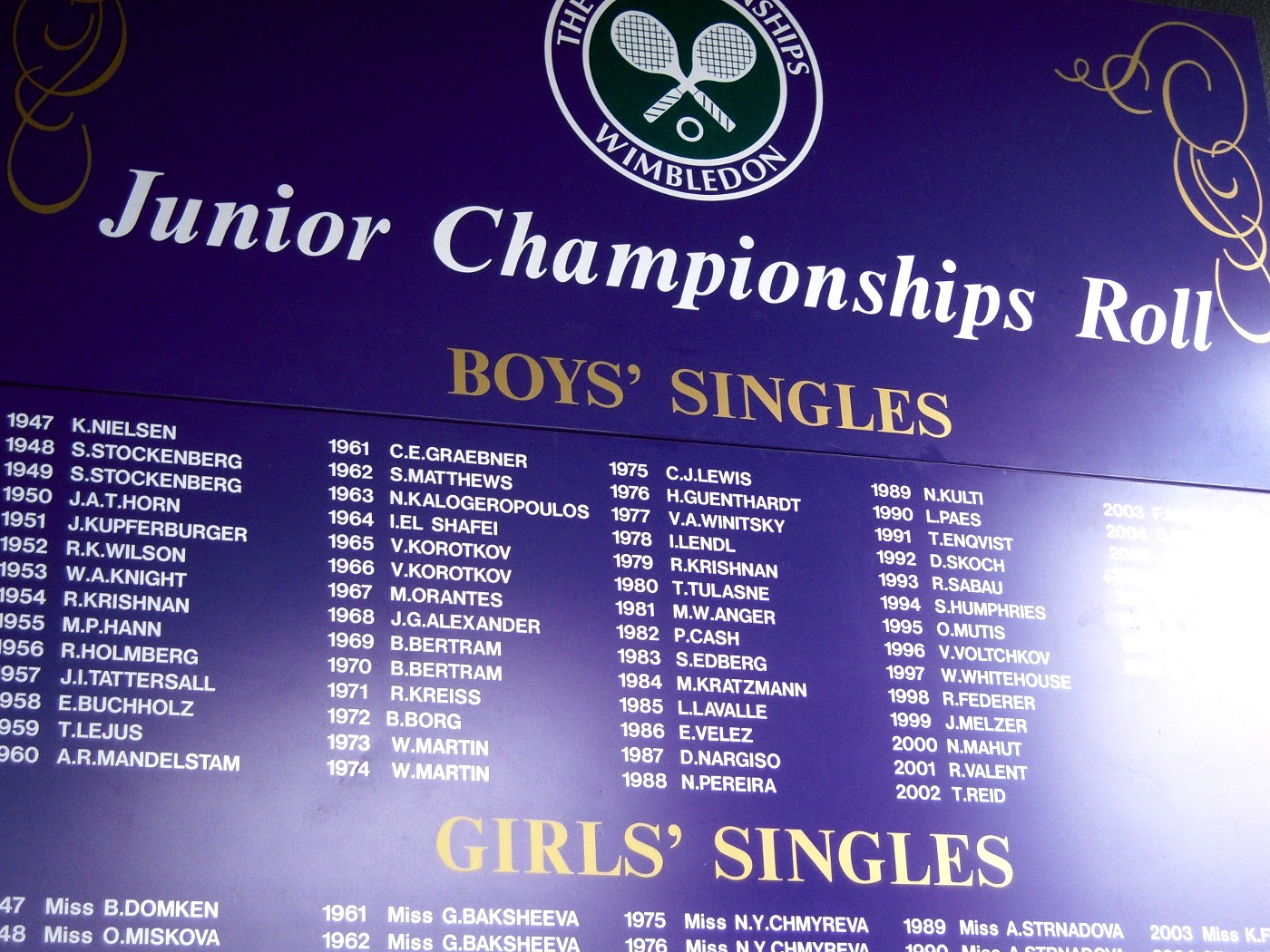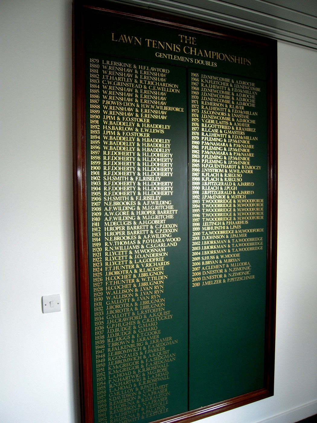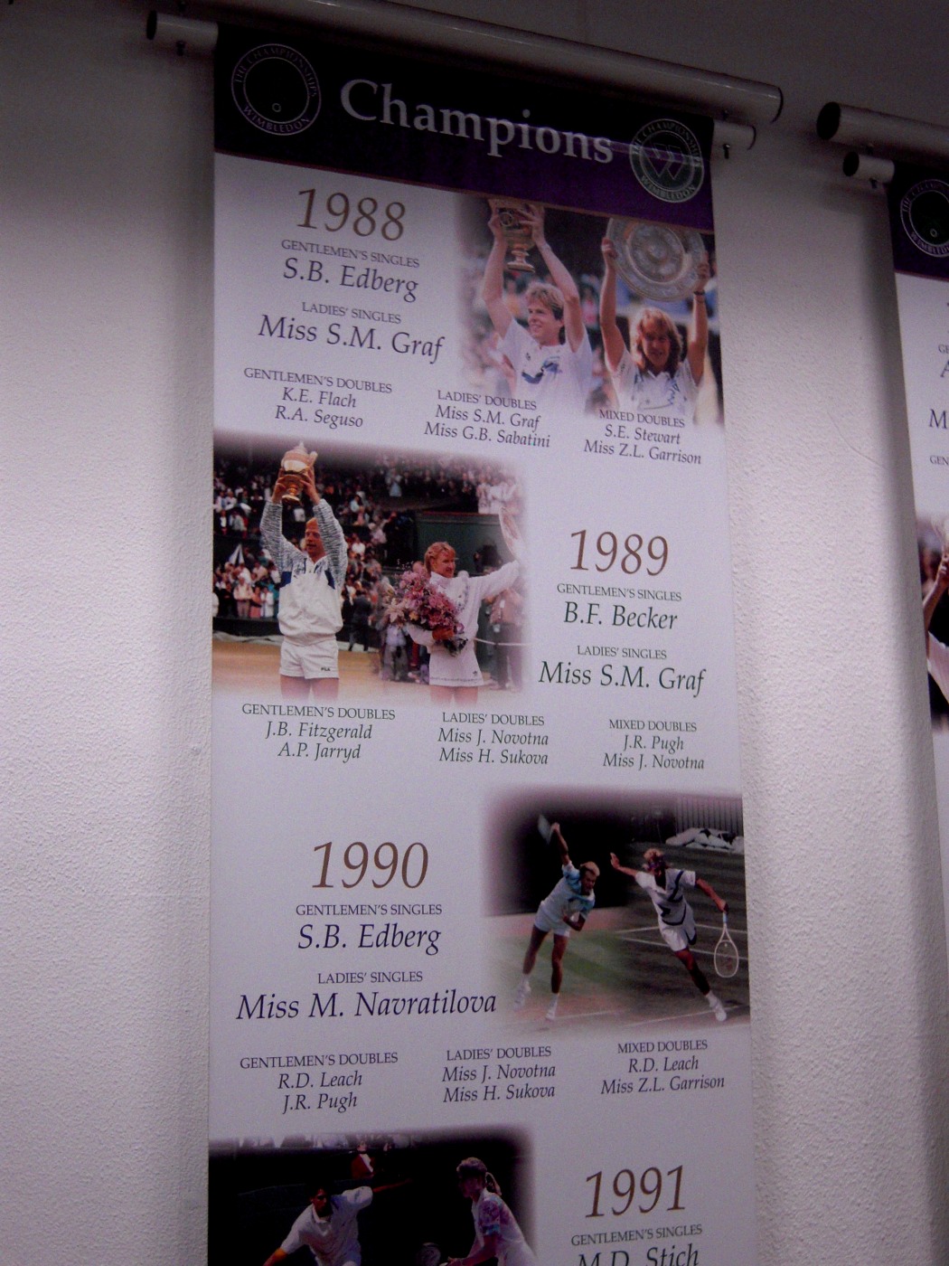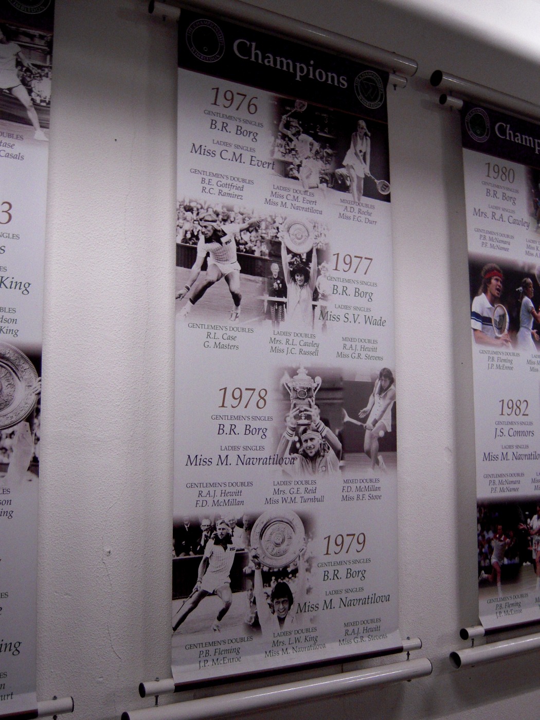 Överallt springer och klättrar människor som jobbar med att laga, putsa och måla saker till den kommande säsongen eftersom vi är här under påsken och det börjar kännas att det närmar sig men vi får också en tur i mediacentret där de som vill kan ta plats i stolen där framme och låtsas bli intervjuad. Här tycker jag som ofta ordnar stora internationella möten på jobbet att det är intressant för här känner jag igen ackrediteringsområdet och små rum för journalister från all världens hörn. Vidare på rundvandringen blir det ytterligare tillfällen att glädjas som svensk. Vi är de enda med svensk anknytning på den här rundturen och inbillar jag mig eller är sneglar de andra avundsjukt när vi börjar babbla Borg och Edberg med varandra? Till och med listan över juniorer går att njuta av innan det är dags att tacka guiden och återvända till souvenirbutiken med sina snygga kvalitetsprylar för att gå vidare in i tennismuséet.
