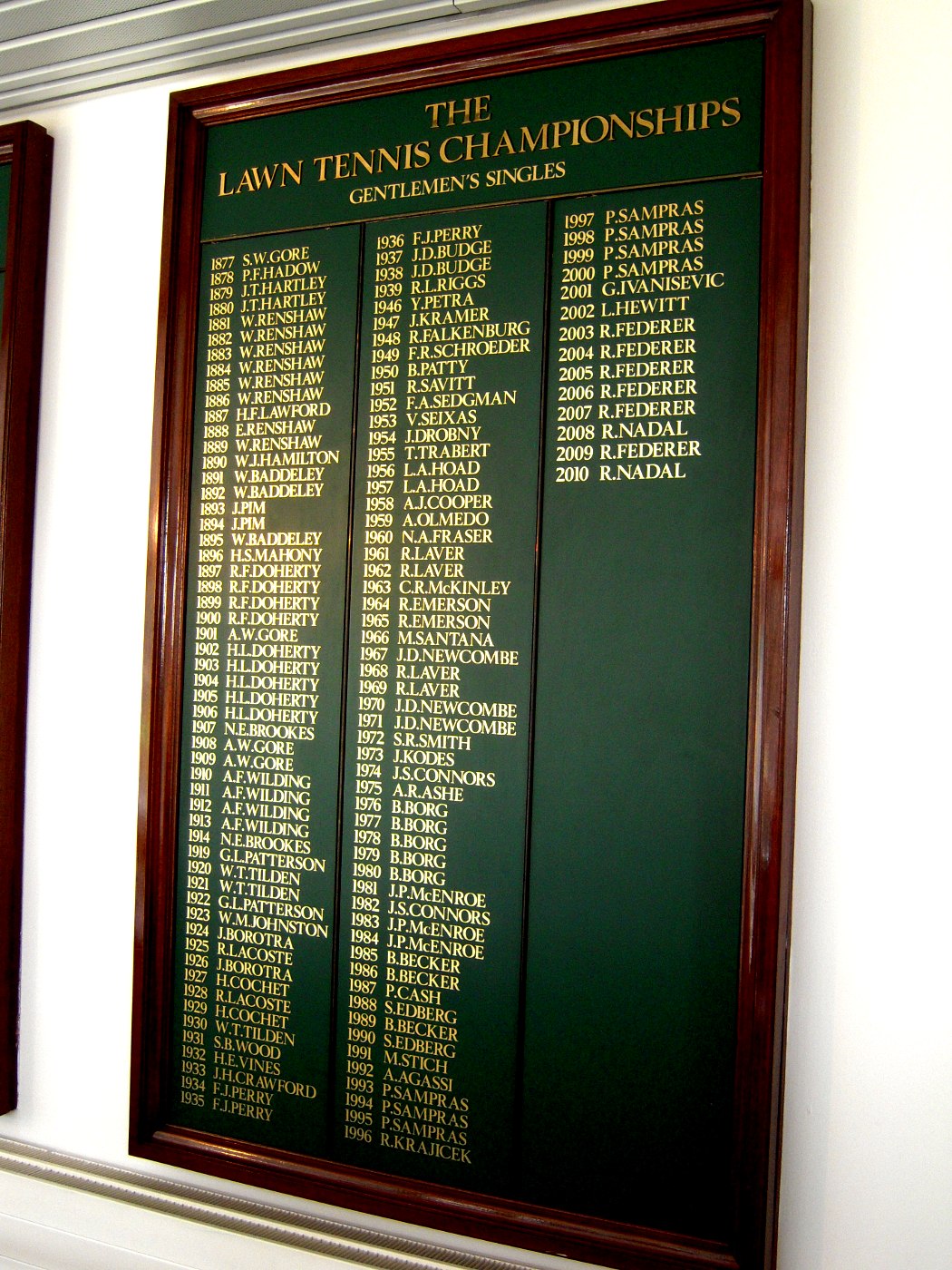 Jag vet inte hur många guider de har men vår hade inte kunnat vara annat än engelsk. Wimbledon var inte hälften så snobbigt som jag väntat mig men han var ändå väldigt stolt över denna helgedom som också var otroligt mycket större än jag trott. Man tänker sig centrecourten och ett par sidobanor för avancemang i dubblar och annat men det är bara början och vi får vandra en hel del upp och ner och in och ut ur olika delar av hela komplexet. Efter en stund kommer vi till en terass där entusiasten hade älskat att sitta och dricka gott i trevligt sällskap och se ut över en massa matcher men just nu är här knäpptyst med undantag för en städerska. Vi går vidare in i huvudbyggnaden och ler snart stort åt bekanta namn på fina minnestavlor över forna mästare i både dubbel och singel.