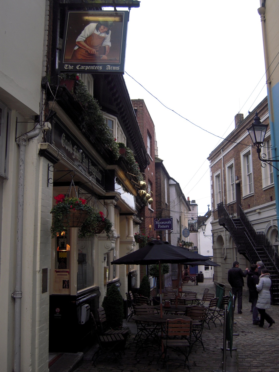 Som jag skrev i mitt inlägg om Windsor Castle så finns det inga matställen inne på slottsområdet men väl utanför och där kan jag rekommendera puben The Carpenters Arms som visserligen ligger i kvarteren alldeles utanför slottet och därför får sin beskärda del besökare men vi hade inga problem att få plats trots att det var påsklov. Hungriga som vargar fick vi bord en trappa ner där även barnfamiljer är välkomna vilket passade oss med en elvaåring i sällskapet. Inte lika mysigt som i baren ovanför men eftersom rummet inte är helt isolerat från den övriga puben så kände vi oss ändå inte bortglömda där nere. Puben ligger i en byggnad med en gågata på vardera sidan och därmed två ingångar och längs den ena ligger en ljus och fin bar med stora fönster där stammisar och turister blandas.
