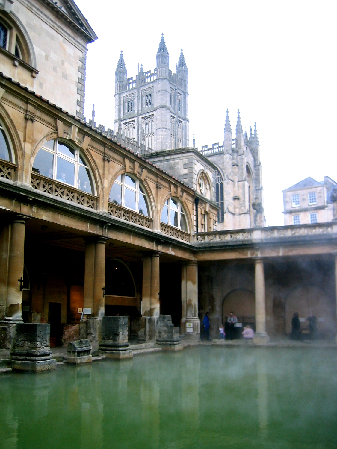 Floden Avon flyter genom staden och vidare genom en vacker dalgång men det som fick romarna att slå sig ner här runt år 60 var de varma källorna. De byggde ett bad och tempel kring dessa och kallade staden Aquae Sulis efter gudinnan Sulis som redan dyrkades av områdets keltiska befolkning. Romarna var bra på det viset att de ofta lät den erövrade befolkningen fortsätta tillbe sina egna gudar och ibland smälte religionerna samman eller påverkades av varandra efter en tid. Idag kallas staden kort och gott Bath eller mer formellt Bath Spa efter att den på 1700-talet blivit just den brunnsort vi känner till från Jane Austens böcker och andra från Baths storhetstid som tummelplats för samhällets rika.