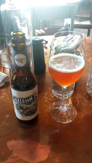 Förrätt struntade vi alla i. Själv hade jag spetsat in mig på efterrätt istället och en titt på menyn visade mest fransk- och svenskinspirerande förrätter med anklever och löjrom i rätterna. De lät alla goda men jag hade gärna sett iallafall något brittiskt. Det går däremot också att beställa in snacks där fläsksvål med tillbehör känns som det mest engelska om du inte väljer den fransk-engelska kombinationen av små petit chouxer med cheddarost. Det står vatten i flaskor på bordet vilket är skönt och till min mat beställde jag in en bitter passande kallad Slussen från Macken i Västerås men här finns massor av annan rolig öl, inte minst från Camdenbryggeriet i London. Vin finns såklart också (och granne ligger deras vinotek Gaston) men de kändes onödigt dyra även för Gamla stan och jag var ju på pubhumör.