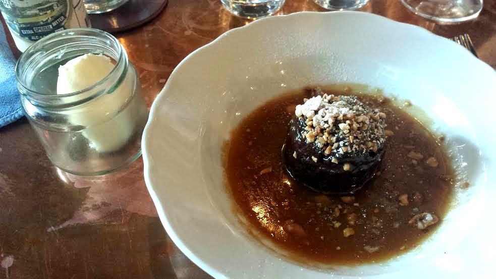 Dags för dessert vilket för min del blev min favorit, Sticky toffee pudding som även det var något som lockat hit mig för var annars hittar man det på restaurang i Sverige (på Green Lion i Malmö finns den iallafall inte längre)? Jag vet inte om Harris haft ett finger med i det hela här också men den var något mindre än man brukar få den i England och hade en bränd ton jag inte var övertygad om skulle vara där men kanske skulle den just det. Delikat var den dock fortfarande och med generöst med sås. Dessutom hade den goda lättrostade nötter på toppen. Glassen kom i en glasburk vid sidan om för att inte smälta vid den varma rätten (överhuvudtaget är uppläggen roliga här) och hade på tok för lite vaniljsmak vilket jag vill ha till en pudding och som det stod på menyn att det var. Nu var det mer som en naturell mjölkglass men konsistensen var bra. Mamma beställde in Eton Mess och här var det minsann inte fråga om någon traditionell grej utan en mycket rolig blandning av fint skurna blodapelsinskivor och pistagenötter. Marängen var gjord i tunna skivor som dekorerade toppen och snyggt inblandad i den var grönpeppar. En riktigt trevlig bekantskap som gjorde alla glada. Det verkar som om denna Eton Mess görs lite olika beroende på vad som är i säsong och bara det är ju kul. En creme brulée fanns med earl grey och citronkräm och den har tidigare funnits med kaffe och citrongräs.