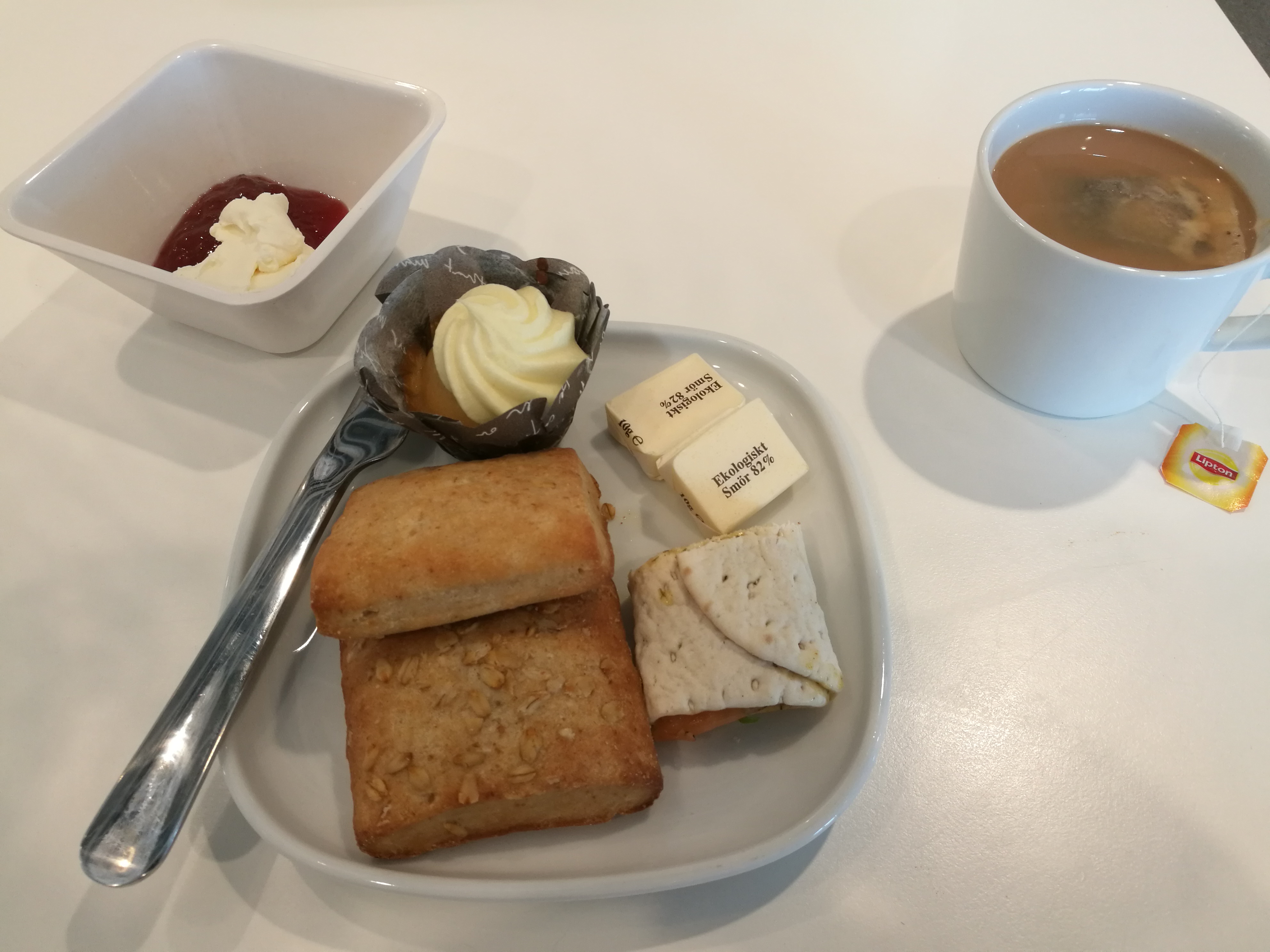 IKEA är ju inte direkt känt för gourmétmat i sin restaurang men däremot för att man får mycket för pengarna. Jag plockar som vanligt åt mig en bricka, mugg och bestick och beger mig bort till det bord där en skylt meddelar att det finns afternoon tea. Skylten talar om att du får välja fyra saker av det som står framför dig och består av tre olika tunnbrödssnittar, scones och en cupcake. Snittarna finns med lax, fetaost eller rostbiff och jag väljer en med lax samt en cupcake och hela två scones för det är trots allt de jag kommit hit för och tunnbrödssnittar kan man hitta lite varstans i vårt långa land. Upplägget är ändå ganska bra förutom att de skulle haft en till sötsak tänker jag. Sedan får jag syn på teburken. Självklart hade jag väntat mig tepåsar, vi är på IKEA, men inte att det mest skulle vara grönt te och skogsbär i samlingen. Jag plockar till mig en Yellow Label i avsaknad av Earl grey och tänker att det iallafall kommer att kännas lite som ett svagare engelskt frukostte.