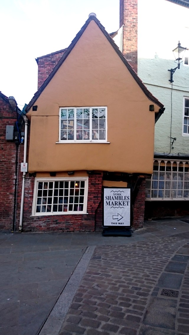 Det sägs att The Shambles är Englands mest fotograferade gata. Hur det nu än är med den saken så är den svårfotograferad. De pittoreska gamla husen står trångt och kastar skuggor som kontrasterar svårt mot bakgrunden. Svårast av allt för fotografen är dock att gatan så gott som alltid är full av turister. Det är lite som med Taj Mahal, kom tidigt på morgonen eller på vintern när det är färre besökare. Gatan heter som den gör för att stadens slaktare en gång huserade här. Nu finns bara ett fåtal kvar vid marknaden runt hörnet eftersom hygienreglerna ändrats, hyrorna dragits upp av politiker från södern och York fått fler turister vilka inte vill se vad som helst. Idag finns här istället souvenirbutiker, hantverk och tea rooms. Ibland kallas gatan även Harry Potter Street och har nyligen fått en butik om hela världens favoritmagiker men snälla, fortsätt kalla den The Shambles. Det bor människor i York och de vill inte bo i Disneyland, tro mig.