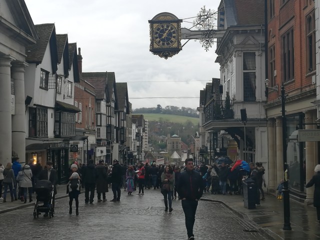 Guildford High Street är stadens stora pulsåder och går du den hela backen upp så belönas du med en fin utsikt om du vänder dig om och ser förbi Guildhall med sin stora klocka. Vi tillbringade en hel del tid här, inte minst beundrandes det vackra skjutsvärdshuset där du idag kan dricka te eller varför inte rent av övernatta. Det hade sin storhetstid när man var tvungen att övernatta här på resan mellan London och kustorterna nedåt Portsmouth.