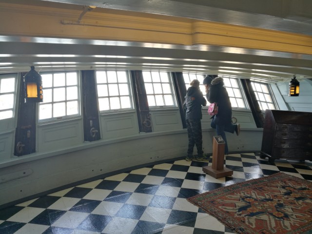 Efter detta ger jag mig akterut och in till just kapten Hardys logement. Nelson må vara amiral i flottan och Victory hans flaggskepp under slaget vid Trafalgar, varifrån han planerar och ger order men hon har sin egen kapten som ansvarar för allt ombord. Hardy och hans navigatör håller till på varsin sida bakom den stora skeppsratten som jag såklart också måste stanna vid med sina sandhinkar prydligt upphängda ovanför om det skulle börja brinna.