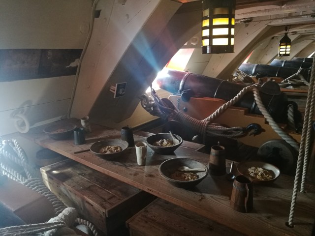 Nelson visade sig alltså inte behöva någon vidare bekvämlighet men när jag traskar vidare mot skeppets kök får jag veta att inte bara han utan alla ombord hade hyfsad mat. Långt ifrån lyx och ofta bröd och gröt men alltid varma måltider inför slagen.