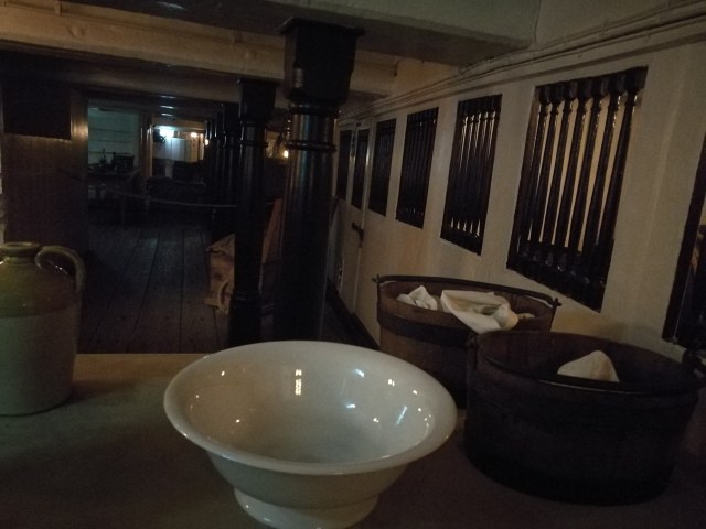Här nere låg också Victorys sjukrum och hit ner fördes självaste Nelson. Eftersom han var så illa däran så fick han ingen egen sjukcell eller ens prioriterad vård utan lades med andra svårt skadade oavsett rank. Det var viktigare att få folk på fötter som hade en chans. Nelson fick istället en stor mängd cognac medan han blev mer och mer medvetslös och till slut domnade av. Så slutade livet för en av de riktigt stora och audioguiden berättar hur det till slut blev förstämning ombord när alla förstod vem som låg där nere. Tack och lov kunde han det här med sjöslag och hade redan fått viktiga manövrar gjorda så att slaget kunde vinnas. Victory var däremot även hon vid det laget sönderskjuten och den 25-årige snickaren ombord ansvarade för att snabbt täta de många hålen innan hon sjönk. Han lyckades och det gick till slut att bogsera in HMS Victory i hamn så att hon senare kunde ta hem Nelsons kropp.