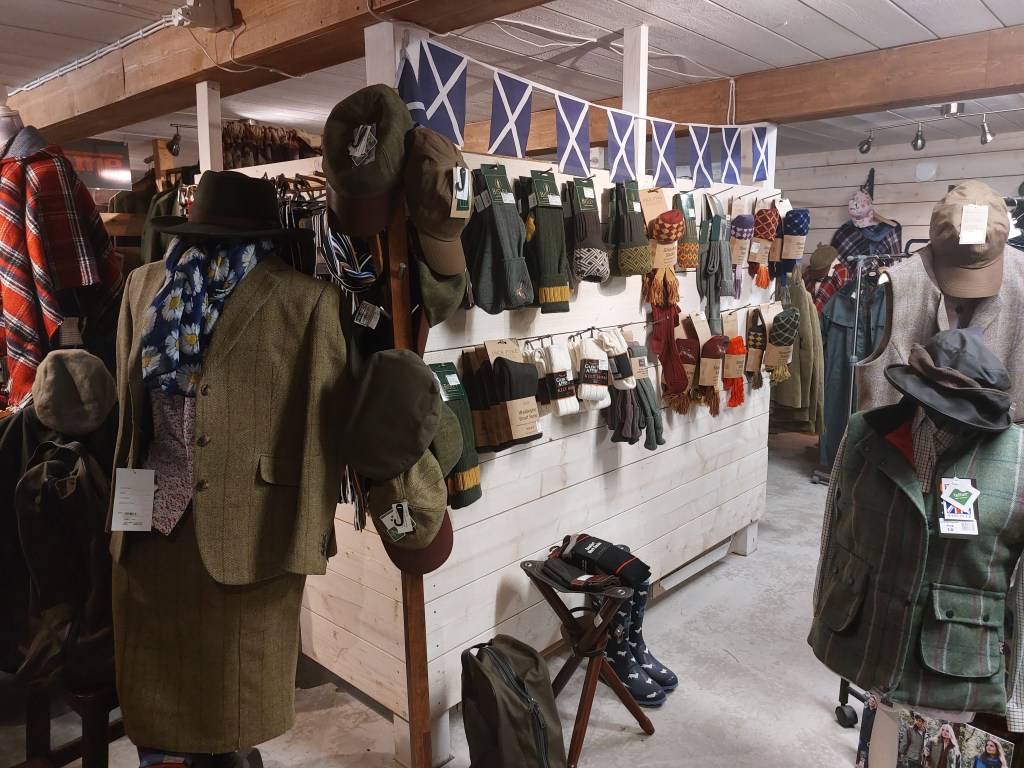 Harris Tweed, Hoggs of Fife och Walker & Hawkes är några av de stora märken som finns och bland oljerockar och hattar är populära Barbour nästan det enda som lyser med sin frånvaro. Ullstrumpor i massor men också annat du förknippar med jakt och fiske såklart såsom fällbara sittpallar i läder, fina termosar och visselpipor. Det säger sig själv att det också finns en avdelning hundprylar med allt från brukstillbehör till saker du inte visste att din hund behövde.