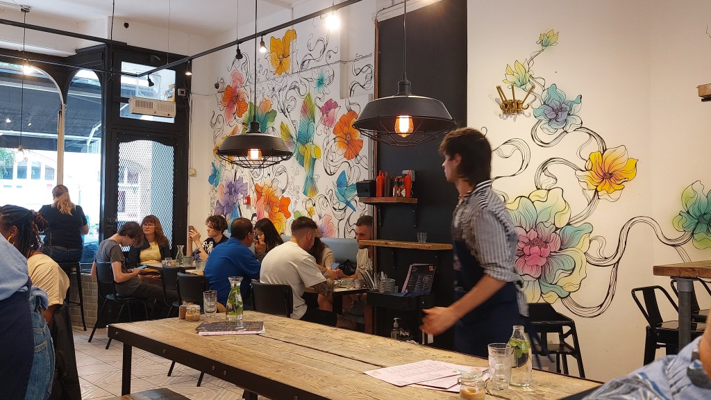 Välkomnande inredning full av färg väntade när vi klev in. Här finns små mysiga hörn, ett jättebord att dela och barstolar i fönstret till den som äter ensam och vill spana på gatulivet. Vi slog oss ner och började studera menyn och det var inte helt enkelt att bestämma vad vi skulle ha för allt såg jättegott ut. För min del blev det Eggs royale som är något av det bästa jag vet. Ett något hårt men gott surdegsbröd med härligt toppat med fin lax och perfekt ägg och sås. Dottern tog en äggröra som var härligt gul och det märks verkligen att Half Cup tar sina ingredienser på allvar och köper in mycket lokalt och ekologiskt. Titta på deras hemsida ovan så ser du mängder av läckerheter i form av hemgjorda bönröror, shachuka, turkisk frukost och annat. Glasdisken vid köket kunde jag inte ta kort på eftersom där var kö men åh så många bakade frestelser den lockade med. Här finns också allehanda shakes, både hälsosamma och mer dekadenta.