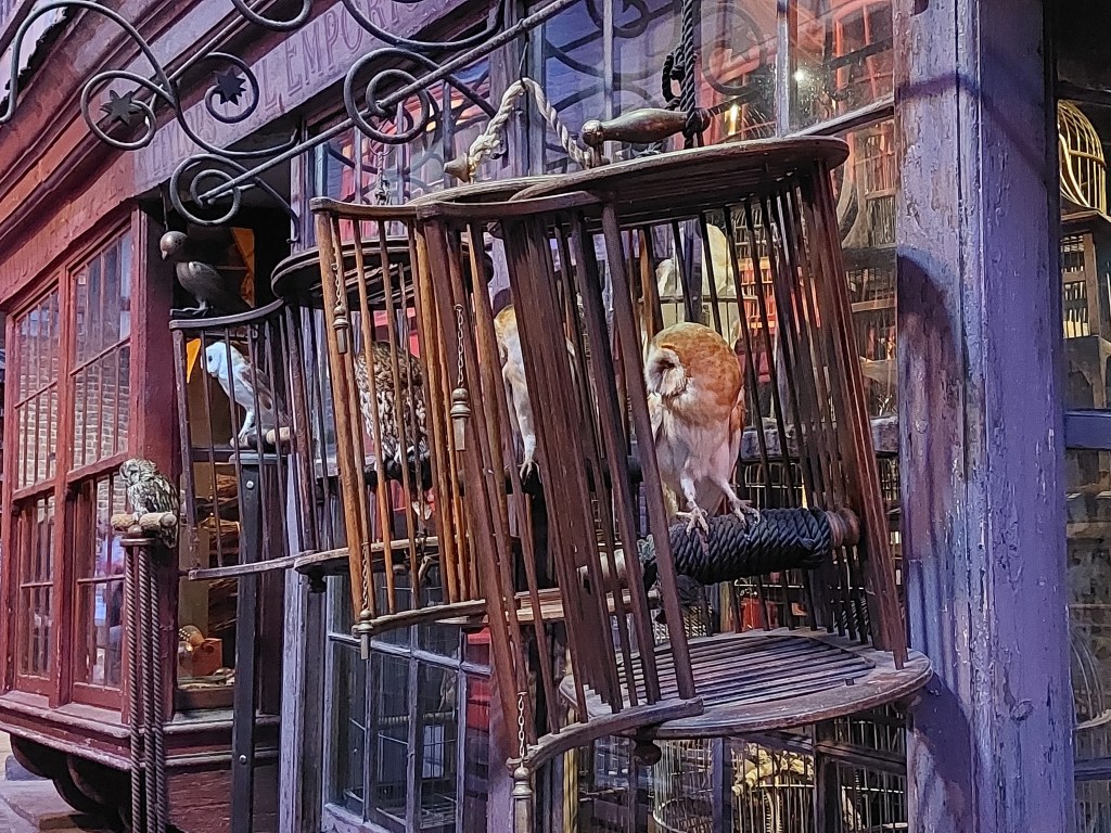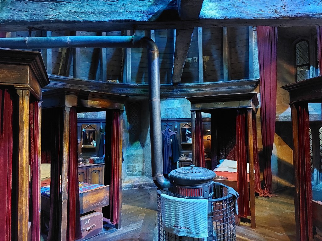 En av mina favoritdelar blev besöket i skogen där spindelnäten hänger över dig. Min dotter avskyr spindeln Aragog men jag tycker han är rätt söt med sina jätteögon – som verkliga spindlar i närbild. Här dyker också fler av skogsdjuren i Harry Potter upp och jag påminns om Byteatern i Kalmar och deras magiska värld på 70-talet när jag strosar runt där i mörkret innan skogen plötsligt tar slut och du kliver in i en helt annan värld – King’s Cross Station. Där står det maffiga, röda loket i all sin härlighet och pyser och du är välkommen att gå igenom det även om du inte kommer att få njuta av Glenfinnanviadukten utanför fönstret utan mest de andra besökarna och en souvenirbutik som säljer tågrelaterade saker du inte hittar i de andra butikerna på turen.
