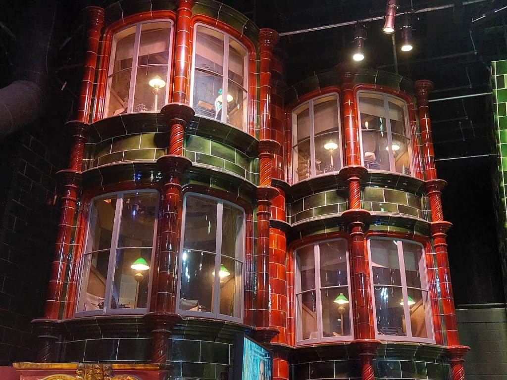 Nästa del av besöket inleds med diverse spännande teknik. Hur rör sig Dobby? Du kan interaktivt ha kul medan du upptäcker detta liksom hur flera drakar och monster skapats och hur man gör läskiga händer och liknande. Allt som allt känns det som om Harry Potter själv kommer i andra hand under besöket. Det är så många andra spännande karaktärer överallt, inte minst de kortväxta banktjänstemännen i sin vackra sal. Där händer det grejer vill jag lova, både i den vackra skattkammaren och när draken vaknat. Sedan blir det genast lugnare på Diagon Alley där man vill ställa sig och ropa ”detta är inte Shambles”. Ljussättarna har gjort ett fint jobb med dag och kvällsljus som varieras under tiden du är där och strosar förbi de kända butikerna. Hogwarts står ju inte i det skotska höglandet på riktigt. Istället är det här du får se det från utsidan in i minsta detalj. Den massiva modellen imponerar och är en magnifik avslutning på ett spännande besök i filmens värld där också konstnärerna och modellbyggarna hyllas på vägen.