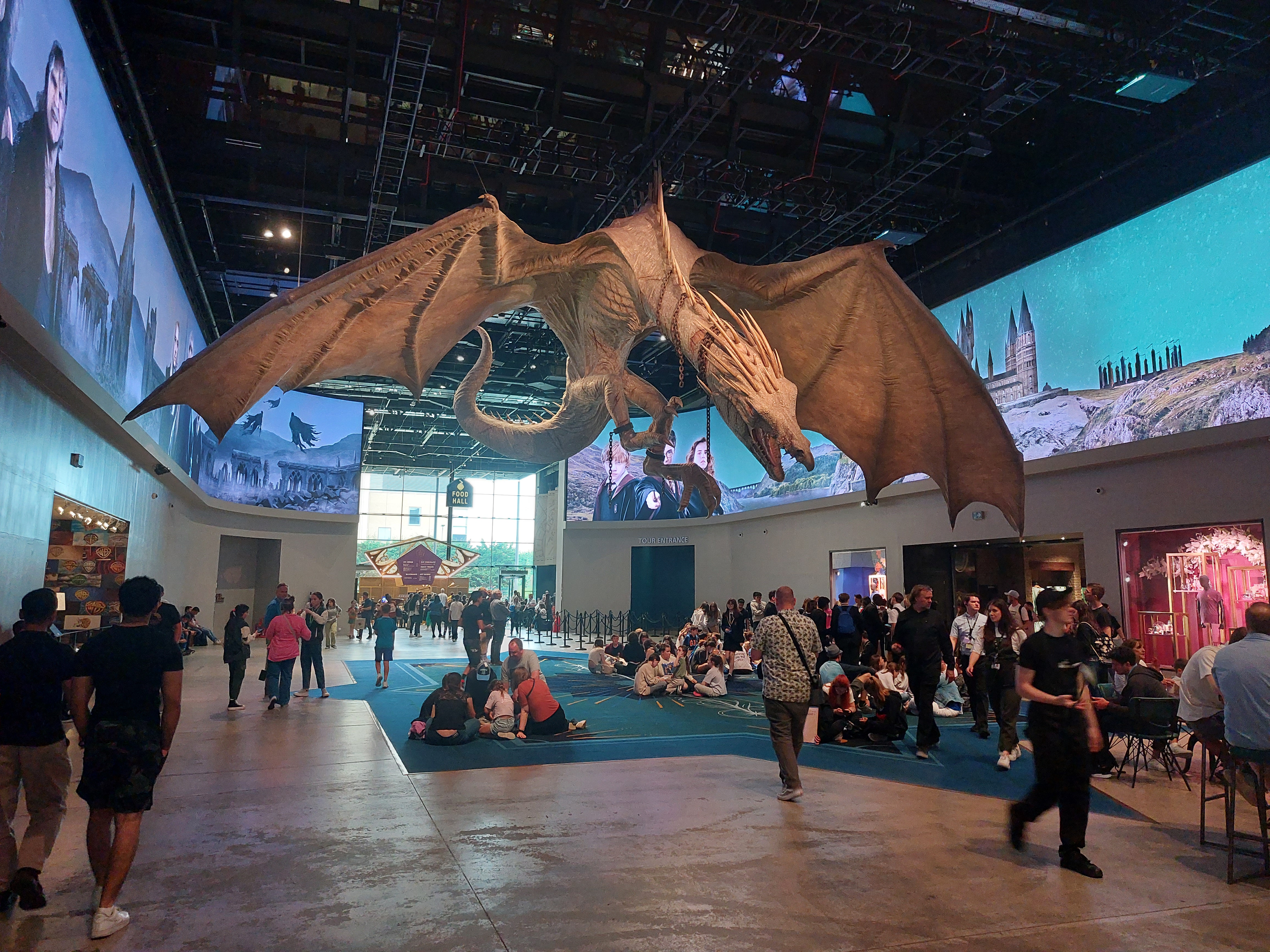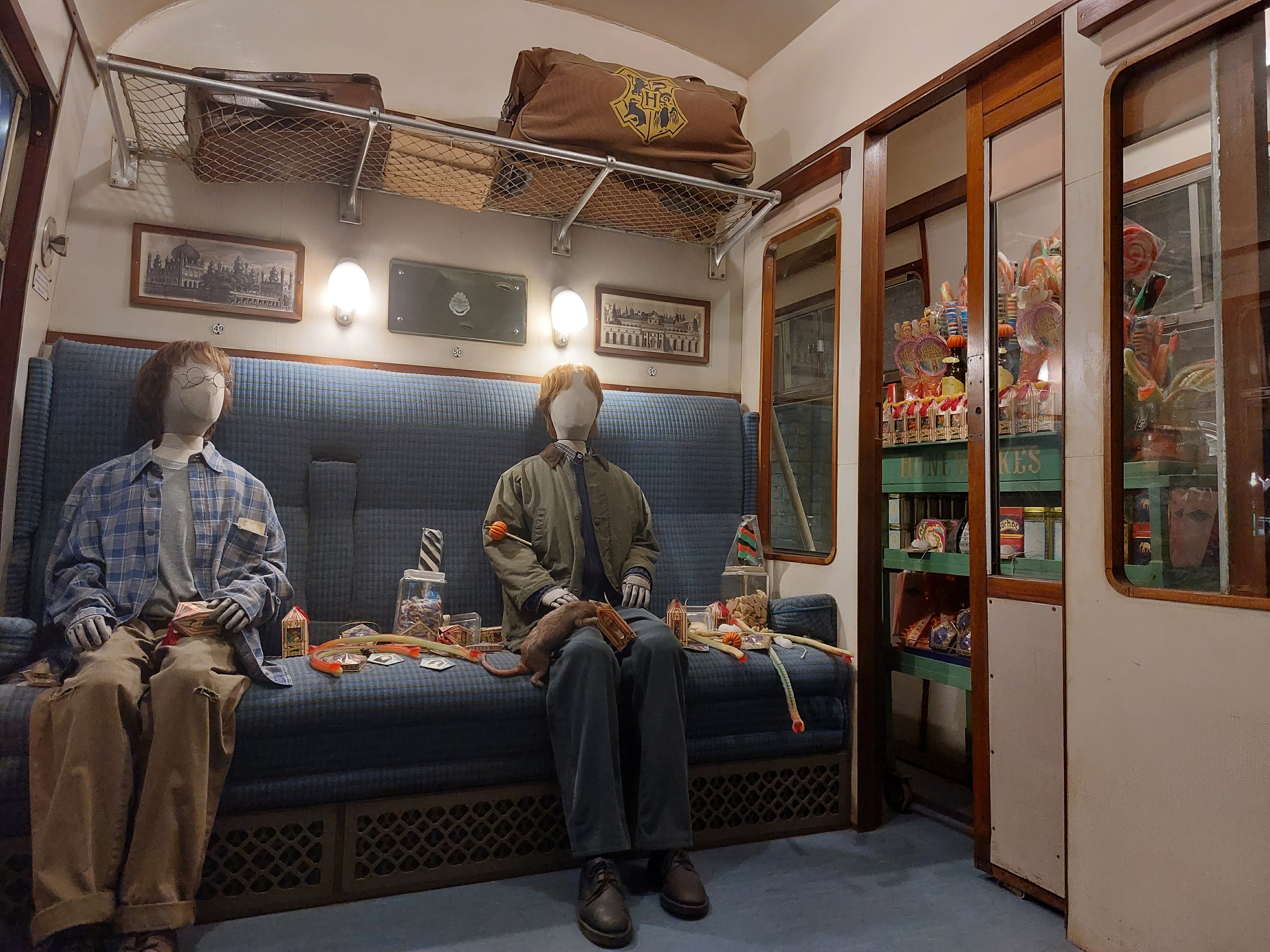 Det första du måste göra är att boka ditt besök på sajten jag länkar till ovan och detta i god tid. Vi bokade sisådär tre månader i förväg och eftersom det var högsäsong fanns det då mest kvällstider från 17.30 kvar vilket passade oss bra för då kunde vi göra andra saker fram till tidig eftermiddag men du kanske vill hänga på låset när de öppnar istället. Hittar du inga biljetter och är desperat så finns det busspaket från centrala London där inträde ingår men då är du beroende av dem. Visst kan tåg bli försenade men det är större chans att bussar hamnar i motorvägsköer i den täta trafiken runt London så att det går åt onödig tid till detta. Jag rekommenderar alltså att du bokar på egen hand. Studion ligger ute i Leavsden nordväst om London och du tar tåget från Euston Station som är lätt att nå. Eftersom det är pendeltåg så räcker det om du har Oysterkort och du kan då alltså även blippa ditt bankkort för att ta dig till stationen Watford Junction. Där väntar transferbussar i form av dubbeldäckare som du inte kan ta fel på och om du just missat en så kommer det strax en till. För att komma in i hela härligheten måste du gå igenom en säkerhetskontroll som på flygplatser men det är inte några konstigheter eller större restriktioner utan bara en koll att du inte har något farligt med dig. Efter detta är det bara att fortsätta in i den stora hallen med sina caféer och ingången till utställningarna som börjar med att du slussas in i vilka regler som gäller och får veta lite om vad du kan förvänta dig när det gäller läskighetsgrad och blinkande ljus innan du så stiger in i Hogwarts stora sal och får beskrivet hur belysningen löstes med alla hängande ljus och där barnen sedan imponeras av sorteringshatten.