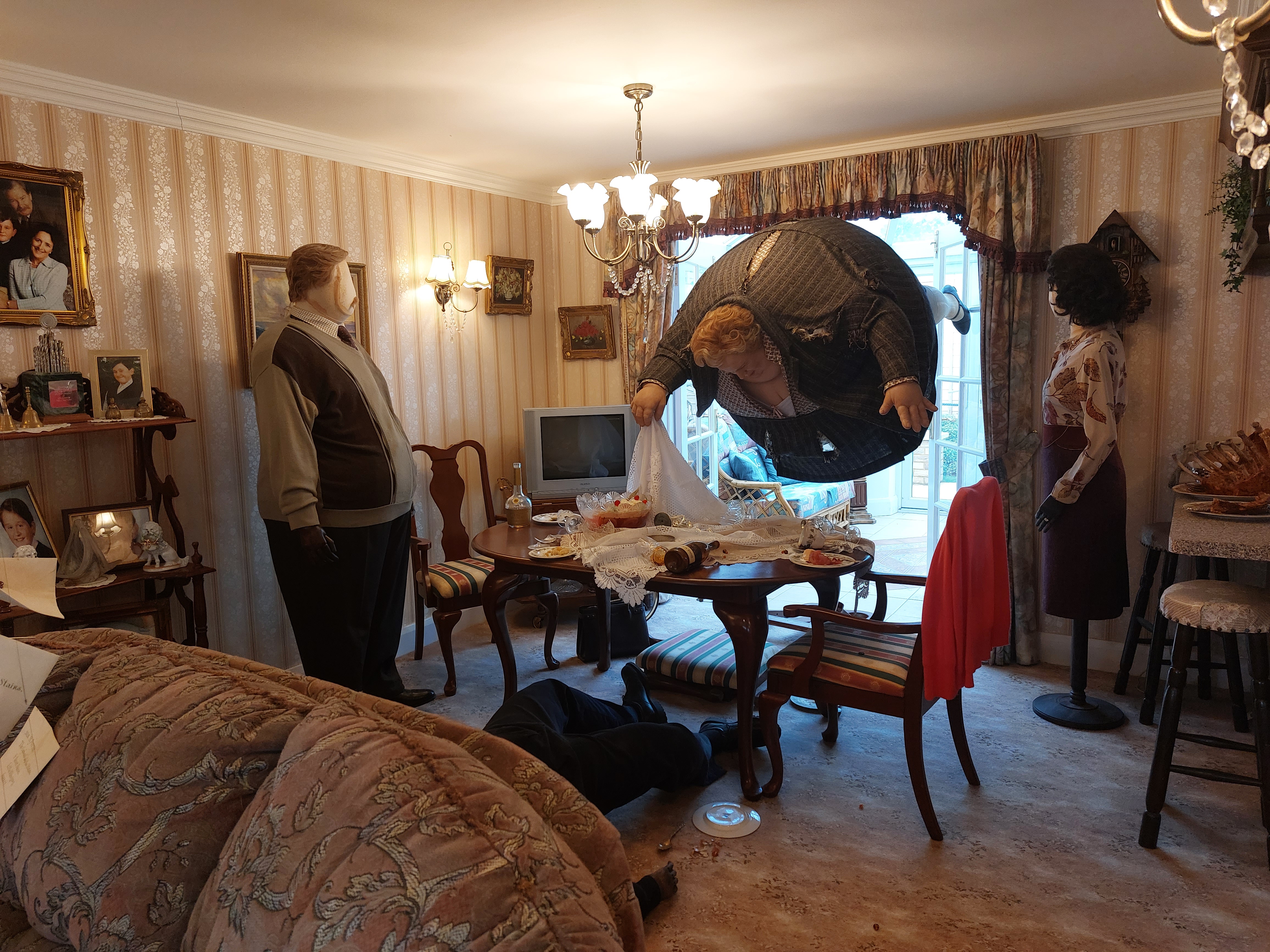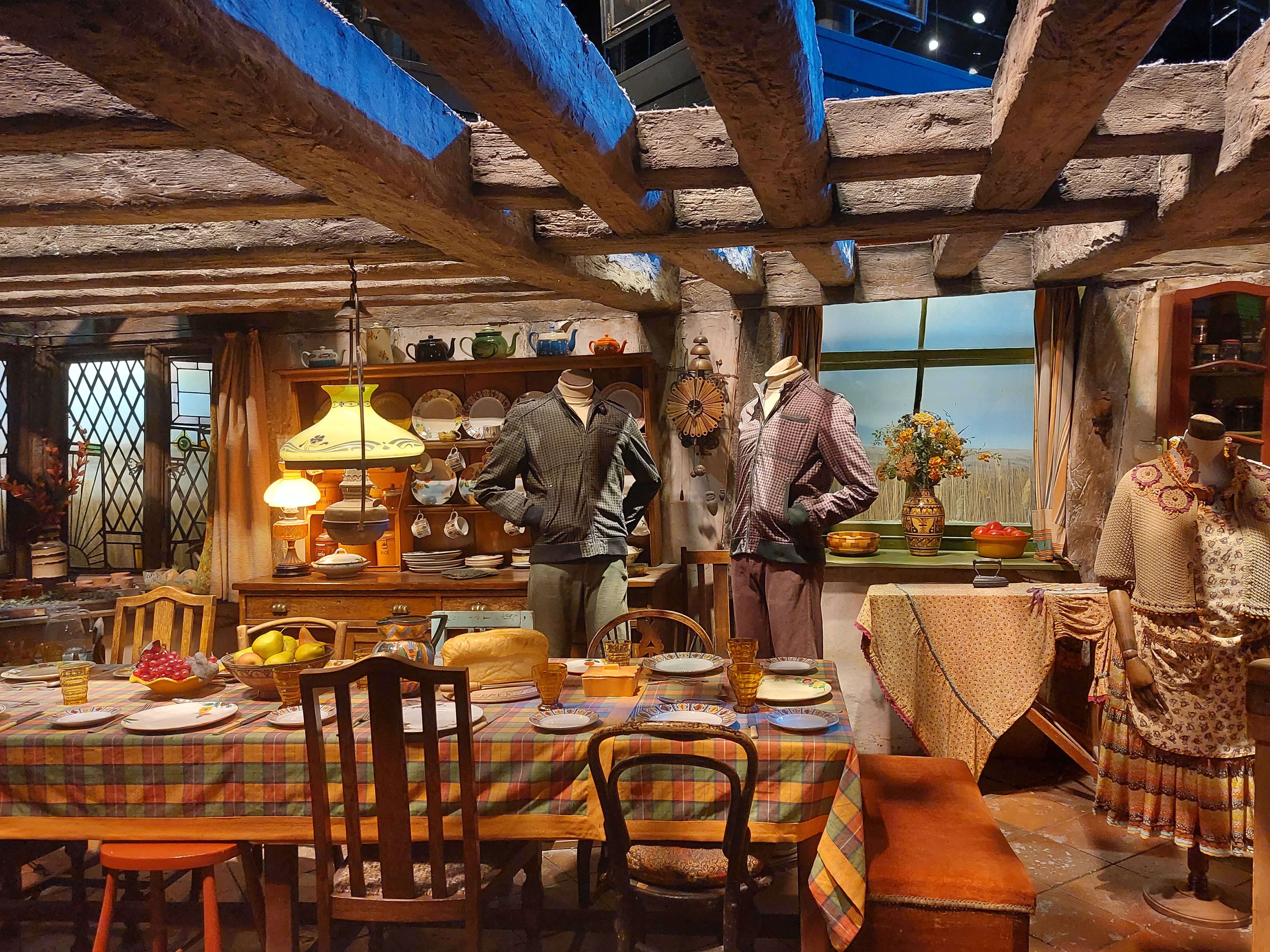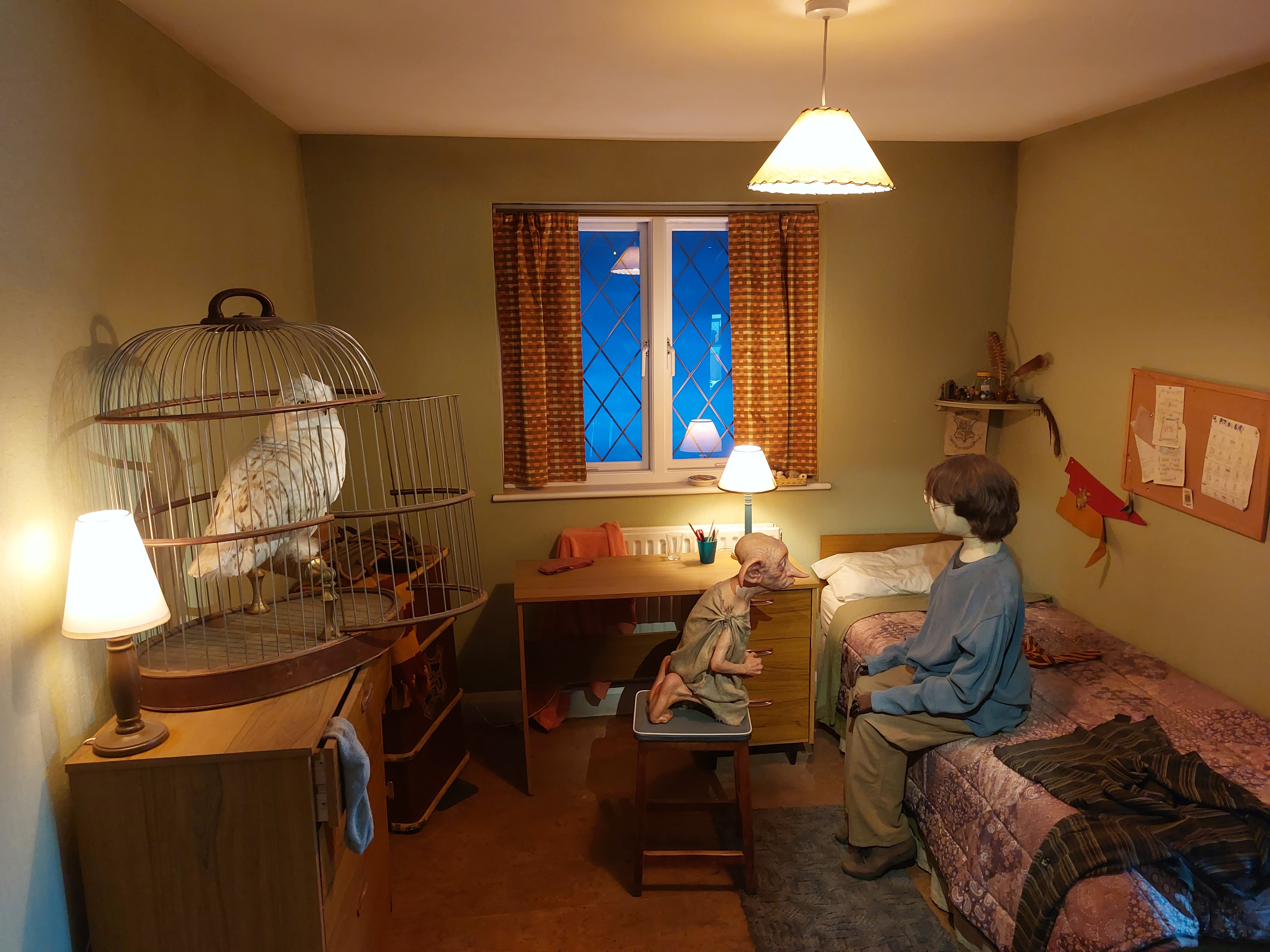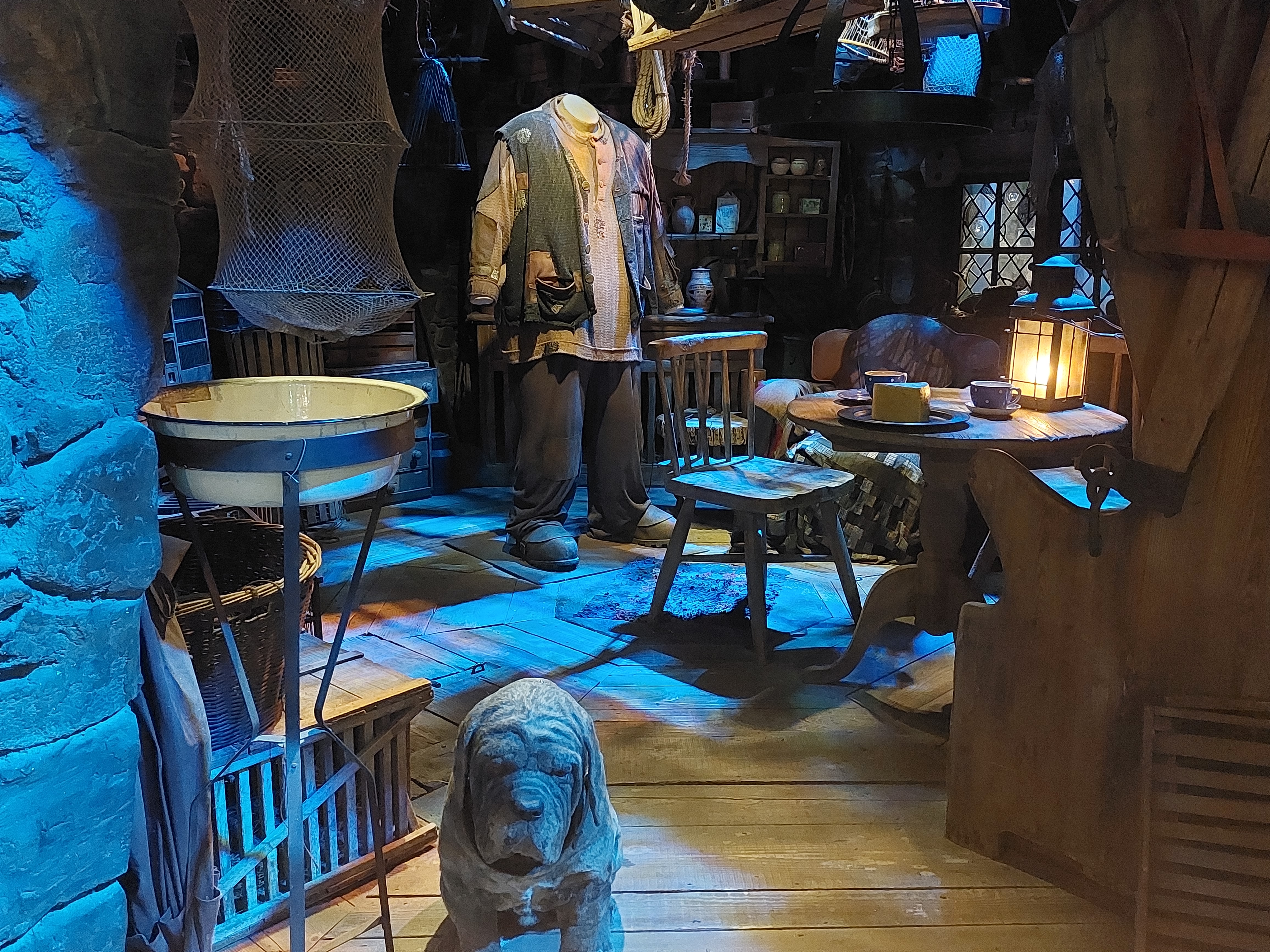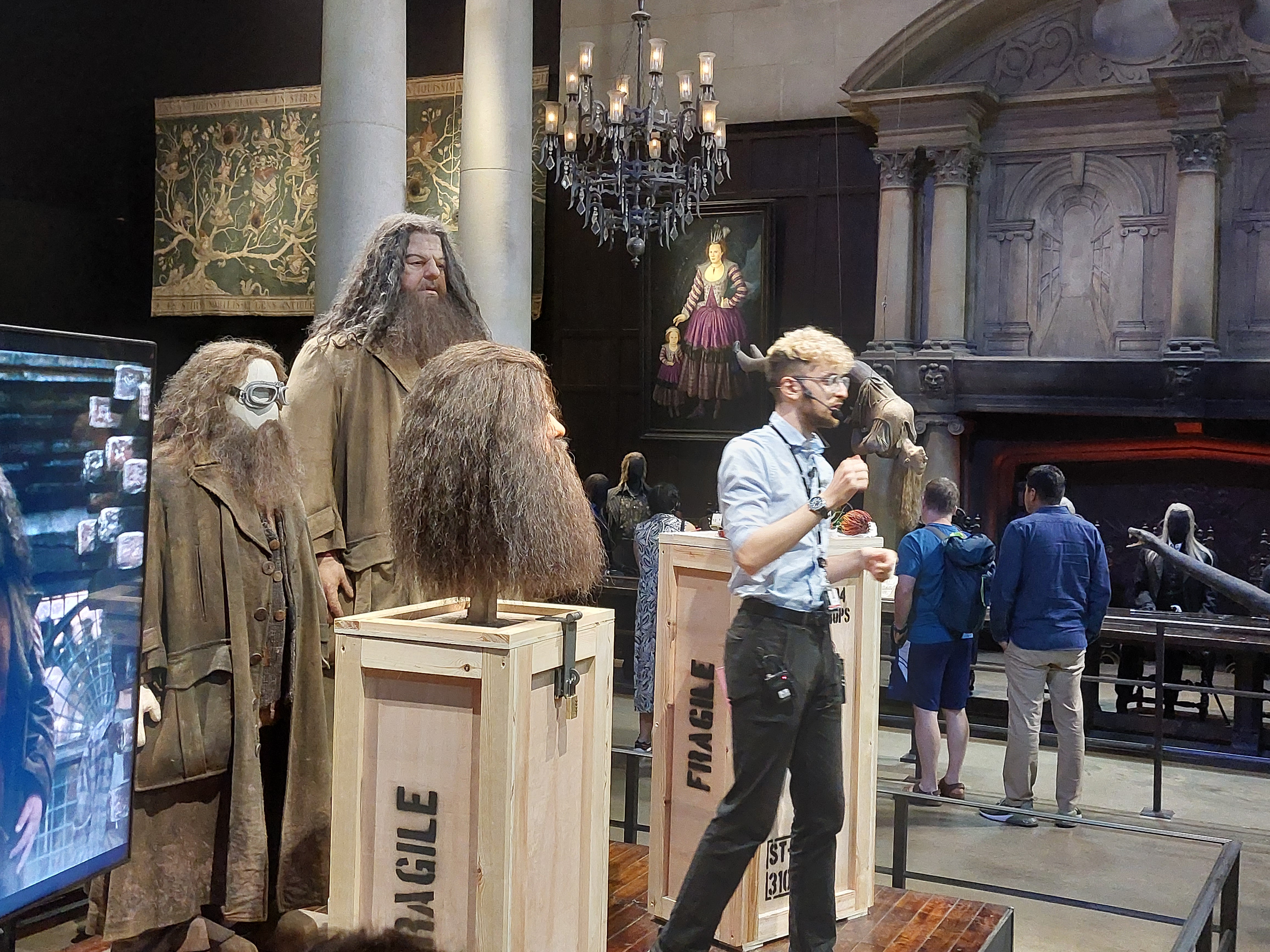 Härnäst kommer hyllningar till regissörer, manusförfattare, kompositörer, sminkörer, perukmakare och alla andra som är involverade bakom kamerorna för att en film ska bli verklighet. Jag vandrade själv ganska fort förbi den eftersom jag är uppvuxen med teater och redan vet hur man gör peruker och att scenpersonalen gör ett hästjobb men det är fint att se hur de uppskattas här och många får nog en ahaupplevelse av att se hur mycket som krävs och hur det går till. Efter denna upplevelse är det dags att möta filmscenerna. Här är Gryffindor-pojkarnas tornrum med sängar, Dumbledores rum, klassrummet för trolldryckskonst där vi får möta en ilsken Severus Snape och såklart Hagrids hydda bland mycket annat och det är en populär del av utställningarna att gå runt bland innan man tar sig vidare till Weasleys hus fullt av saker att upptäcka (vi är ju hos den uppfinnarglada familjen Weasley), deras flygande bil och mycket mer. I den här delen finns också reglerna för quidditch och har du lust att punga ut med ännu mer pengar kan du låta barnen filmas i detta sammanhang framför en green screen. Har du koll på Hagrid ordentligt? Robbie Coltranes karaktäristiska ansikte och röst är vad du ser i närbilderna men i andra scener kan det vara hans stand-in Martin som gör rollen. Allt detta förklaras noga av guider här och du får vara beredd på att ett besök på Warner Bros innehåller fakta som gör att du kommer att se på filmerna med helt nya och kanske lite mindre magiska ögon i framtiden.