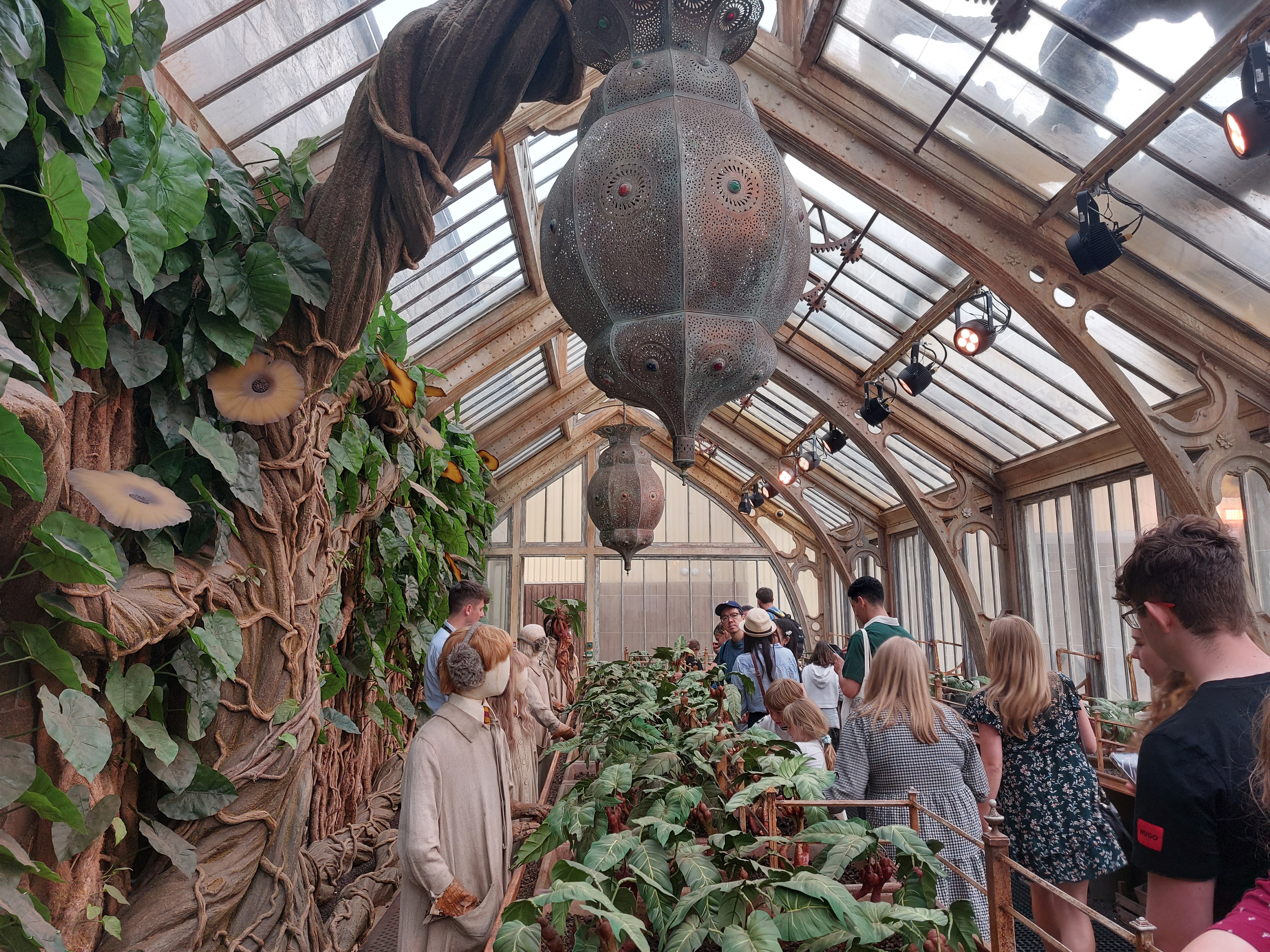 Efter detta har du kommit ungefär halvvägs och jag för min del hade rejält behov av att sitta ner så jag blev själaglad över att ett kafé dök upp som nästa punkt för den som vill. Här hittar du det berömda butterbeer som dricks i filmen och naturligtvis är en stor kassako för alla vill såklart prova vad det egentligen smakar och dessutom får du ta med dig muggen hem. Inget för dig med diabetes för sötare dryck är svårt att hitta och tja, man måste gilla vanilj. Det är väldigt kul att sitta här och titta ut på gården där besökande barn springer runt och jagar varandra med trollstavar innan man själv ger sig ut på den där gården och det blev en annan favorit. Här finns nämligen Privet Drive, Harry Potters tråkiga barndomshem där onkel Vernon spelas av Richard E. Griffiths, en av de viktigaste skådespelarna i min favoritfilm så jag fnissar glatt åt händelserna inne i huset innan det blir dags att ta sig an de skrikande mandrakerna i växthuset som en ytterligare höjdpunkt. Du kan också gå in i den lila trippeldäckarbussen och gå över Hogwarts vackra bro här ute på gården.