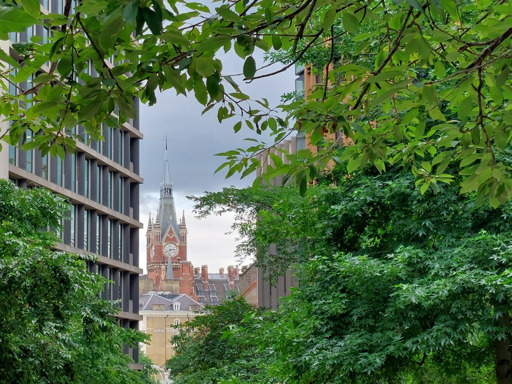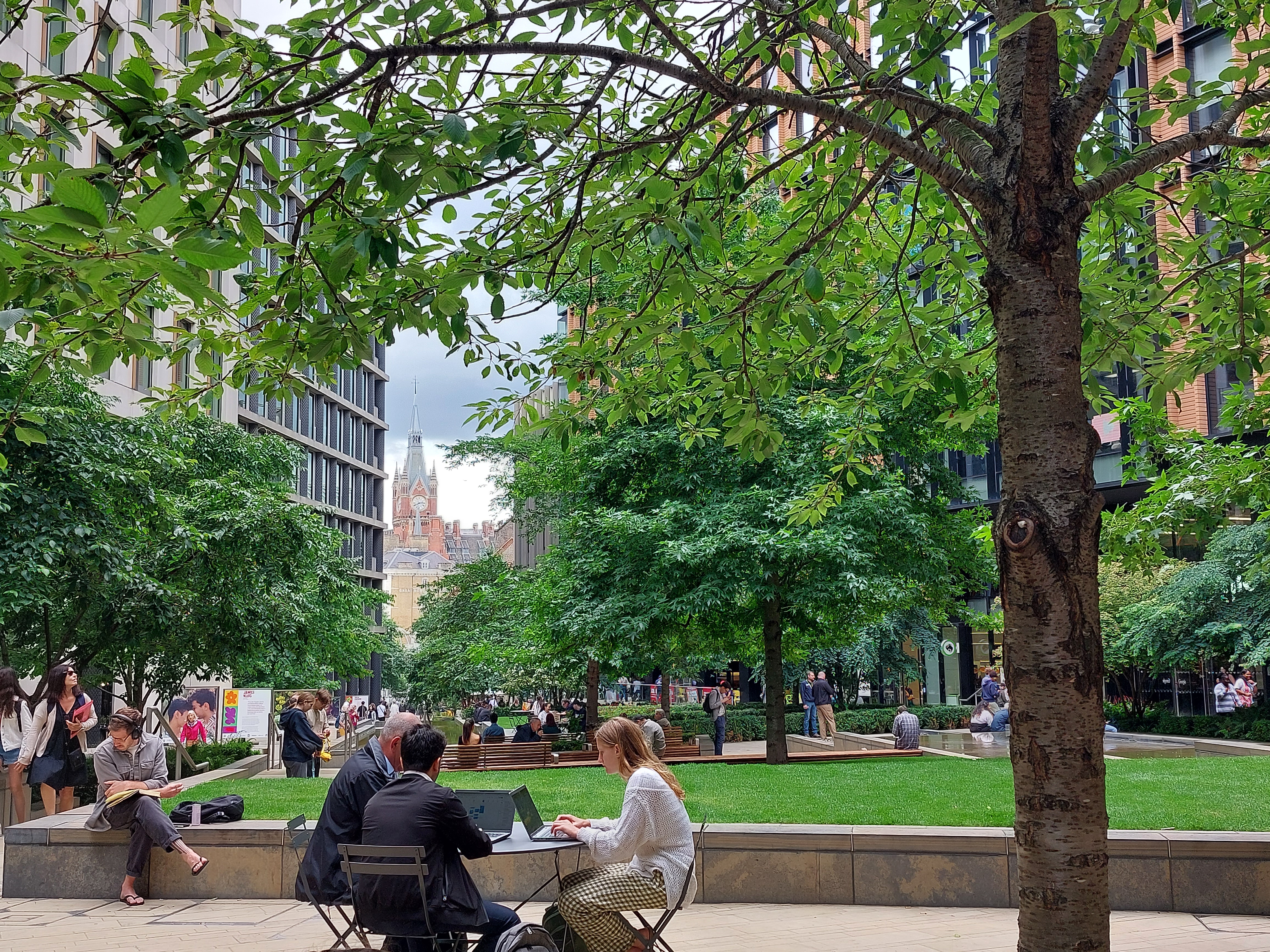 Om du istället vill ta den korta vägen kan du skippa gångvägen du kom på och istället ta dig ner längs det nyanlagda St Pancras Square. Där hittar du som ska med tåget fler vettiga snabbmatskedjor än inne på de två stationerna men framför allt får du se Googles nya jättekontor och en rätt trevligt planerad bit modern stad. Parken känns grön och ombonad och en solig dag lunchar lika många ute som inne, allt till en fin vy av St Pancras.