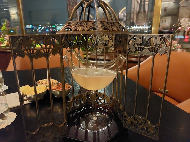 Cadierbaren är ändå det jag gillar mest förutom vårt rum med sin dörrklocka och rofyllda inredning. Här kan man sitta och titta ut, studera andra gäster eller bara njuta av en drink. Jag såg inga kändisar men det är kul att bara se alla olika typer som sitter här. Östermalmsfamiljer, internationella företagsmänniskor och helt vanliga turister om vartannat. Alla är välklädda men det är klart att man ser vilka som har dyra märken och inte. Däremot görs ingen som helst skillnad på gästerna efter hur de ser ut. Jag antar att stamgäster får viss extra service men alla behandlas som viktiga gäster. Här vet man att rika människor kan se ut lite hur som helst och att vem som helst kan vilja prioritera en vistelse här för de pengar man har och då ska man få en härlig upplevelse. Ingen gång känner man som helt vanlig gäst att någon ser ner på en trots all elegans överallt. Jag knockades totalt och det gjorde jag dessutom av deras egen speciella cocktail, Antimon. Jag älskar gin och här får du det med rönnbär, citron, champagne och bitters. Få drinkar är godare och dessutom serveras den i ett fågelformat glas i en orientalisk fågelbur. Det här är en spektakulär cocktail.