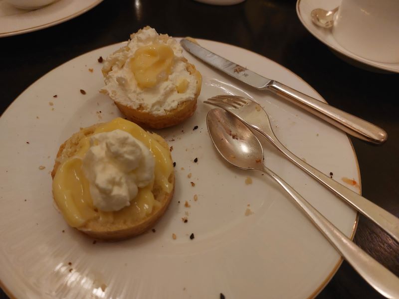 Jag tar alltid sconesen sist för jag älskar dem. Dags alltså för de små sötsakerna med en kompott på en blandning höstfrukter och bär varvat med en frisk kräm. En vacker chokladskapelse med kolakräm, en vallmokaka med en för mig något för mild citronsmak och så en minitartelett med frukt. Sedan alltså scones, varav ett var grovt med frön och ett var ett vanligt. Det vanliga är nästan alltid min favorit när det bjuds alternativ och så även här. Till dessa bjöds svart vinbärssylt, cream cheese med vanilj, vispgrädde och lemon curd. Gott, gott och allt med perfekt service såklart.