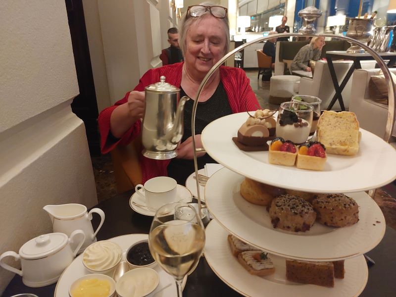 I januari 2021 fyllde jag femtio år och fick en fantastisk present. Världen fortsatte stänga ner. Dryga ett år senare gick det att göra vissa resor igen men då hade jag förlorat min man och resande låg långt ner på listan av saker jag orkade göra. Nästan två år efter den där födelsedagen fick jag äntligen ihop det och kunde utnyttja mitt presentkort på Grand Hotel i Stockholm. Lyxigt med så lång giltighetstid. Jag försökte redan tidigare med dottern men hotellet har ändrat sin hundpolicy och vi hade redan lämnat bort honom när vi var i England. Det blev till att vänta till fler lediga dagar innan jag hann försöka igen, nu med mamma som ressällskap. Presentkortet räckte till ett gigantiskt rum men jag valde ett lite mindre som bara var lika stort som min sommarstuga för på så vis hade jag råd med två nätter med frukost istället. Man vill ju inte lämna när man just kommit. Självklart beställde vi afternoon tea också.