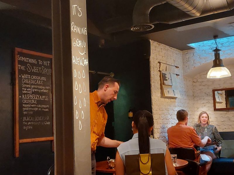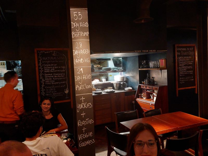 Restaurangens namn kommer från den svarta hjord blacklock som går på den gård i Cornwall som den goda rumpsteken köps in från. Dess köttdjur är av en hotad lantras som lever vidare av den här sortens efterfrågan på bra gräsbeteskött vilket gör det extra roligt att äta på Blacklock när man är en köttätare som dragit ner på köttet i veckorna för att äta miljövänligare och godare kött när det går. Skulle du nu vilja gå hit med en vegetarian i sällskapet så går det såklart också, det här är London 2023. Då är det griljerad rotselleri som står på menyn med samma tillbehör som till köttet, fast utan ankfett i potatisen naturligtvis. Skulle tro att den är välgjord som allt annat här.