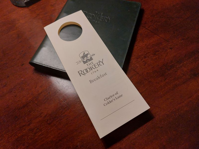 Tillbaka på mitt rum är det dags att tänka på vad jag kan vilja ha för frukost om något. Frukost kostar extra som så ofta i London men här beställer du bara det du själv vill och hänger ut beställningen på din dörr innan midnatt. För min del blir det bagel från kända Brick Lane med lax och sour cream. När jag lagt min beställning sätter jag mig och läser texterna om de personligheter som namngett rummen. På The Rookery har rummen inte nummer utan är uppkallade efter allehanda lokala personer i olika samhällsklasser, till exempel bagaren vars ugn finns kvar i ena husets källare.