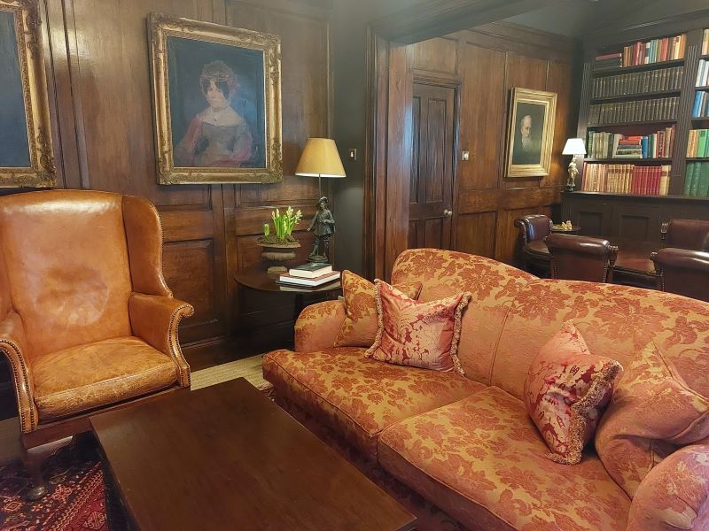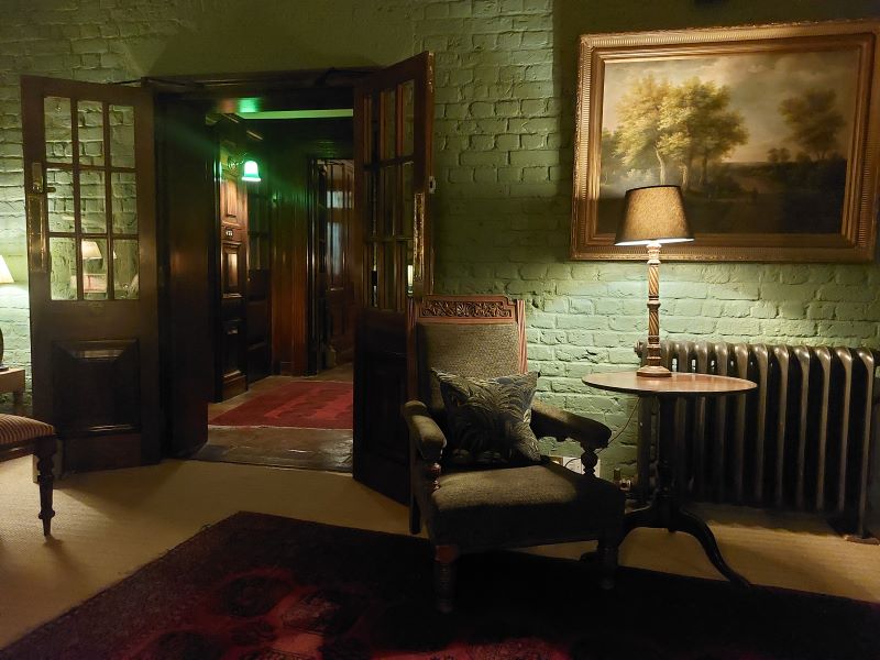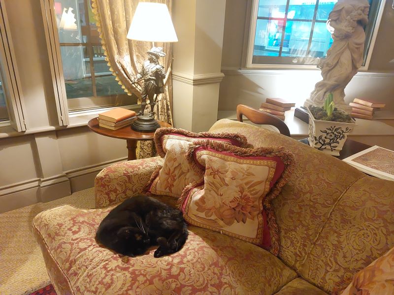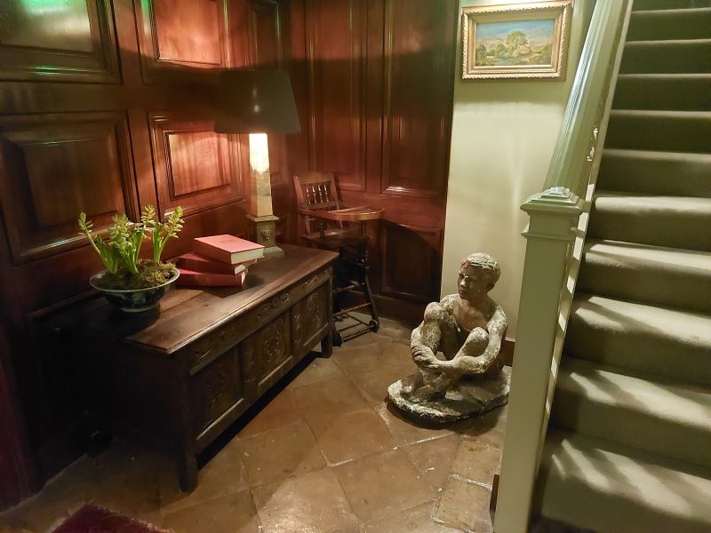 Vi fortsätter in i biblioteket där brasan just tänds och där det finns hyllor av historieböcker men sedan är det är dags att kika in i vinterträdgården. Där finns utgången till den riktiga lilla trädgården på baksidan och i rummets stora soffa sitter en man och läser. Eller rättare sagt, han försöker läsa men har fått ta paus för där och då klappar han husets stora, svarta katt Bagheera som oskyggt satt sig i hans knä. Jag är såld! Att det fanns en katt visste jag men att se den interagera med gäster i den här miljön…