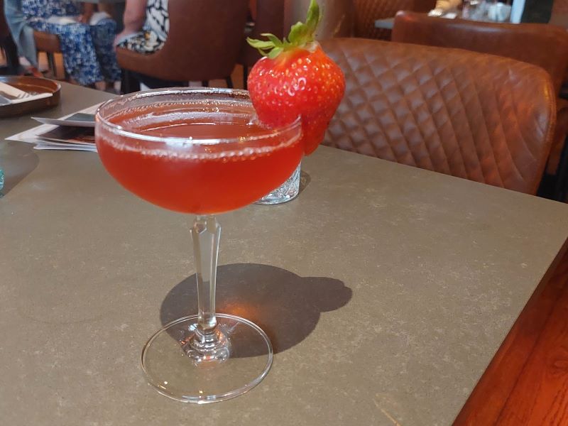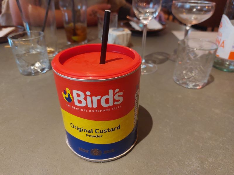 Till efterrätt tog dottern en mille feuille med jordgubb och glass men vi andra struntade i dessert och själv tog jag en cocktail istället. Just här var jag väldigt nyfiken på en av deras specialare i form av Rhubarb & custard. Jag älskar rabarber och jag älskar roliga idéer så när de hade den här på menyn var den given. Rabarbergin med destillat på crème anglais, lite Licor43 för att förstärka vaniljtonen och så citronjuice för att det inte skulle bli för sött. Allt serverat i en klassisk förpackning Birds vaniljpulver. Hur god och knäpp som helst.