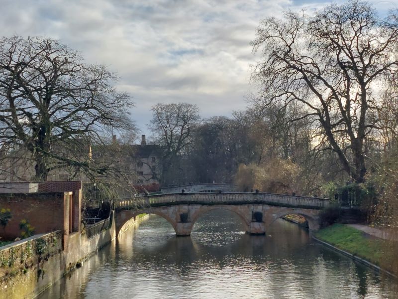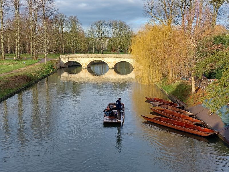 När du tagit dig förbi Trinity och St John´s kommer du till den runda kyrkan. Där kan du ta vänster längs Bridge Street över floden Cam och se lite punting med de speciella flatbottnade båtarna på floden (eller för den delen ta dig en guidad tur själv) och kika förbi Magdalen College och puben Pickerel som sägs vara stadens äldsta. Innan du korsar floden kan du annars följa den norrut. Du kommer då till den stora parken Jesus Green vid just Jesus College där du hittar flera trevliga restauranger och pubar men jag hade hört att solen var på väg att kika fram och hade andra planer eftersom det ändå inte var sommarväder så jag vände tillbaka mot Trinity College och ner längs pittoreska Trinity Lane mot floden. Vill du så kan du ta dig tid att leta upp Suckarnas bro också om du går i de här kvarteren men då får du snirkla omkring bland gränderna runt diverse stängda collegeträdgårdar så den ser du bäst på en tur i punt om du ändå tänkt ta en.