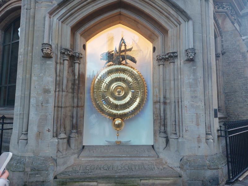 Efter detta kan du göra som jag och vandra Trumpington Street tillbaka upp mot de centrala delarna med St Catharine’s College på ena sidan gatan och Corpus Christi på den andra. Du vet när du närmar dig marknaden igen för då ser du mängder av turister i en gatkorsning där de står och beundrar The Corpus Clock som Stephen Hawking har varit med och kalibrerat. Uret och gräshoppan är i rörelse och det är en rätt häftig skapelse. Annars är det rätt andäktigt bara att ha vandrat längs Trumpington Street och sett alla plaketter på husen som visar var kända vetenskapsmän och kulturpersonligheter bott och studerat. Här i korsningen måste du svänga höger och besöka den gamla puben The Eagle. Klicka på mitt inlägg om den så ser du varför.