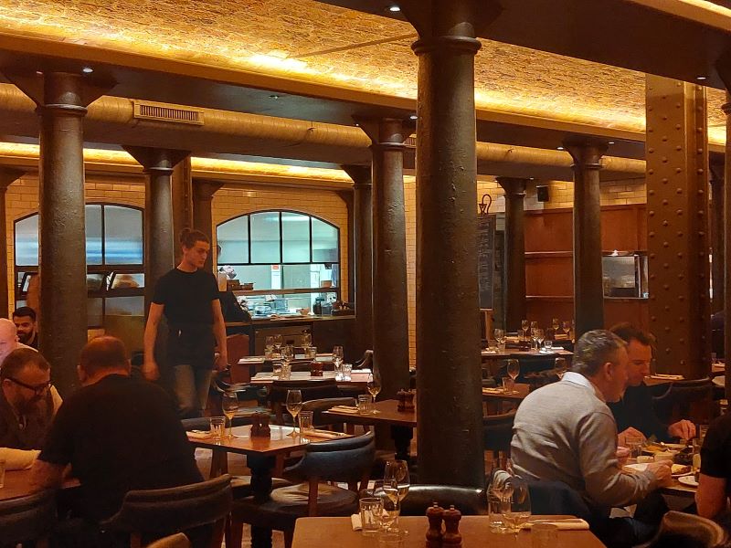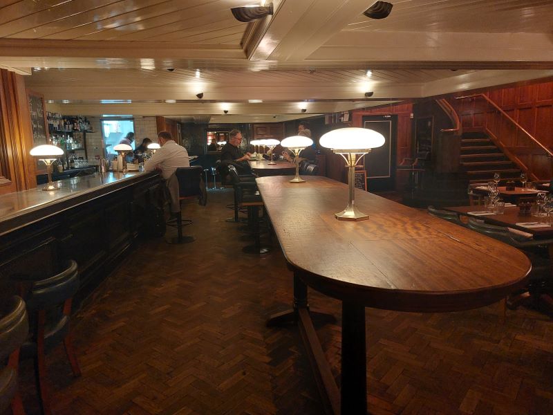 Jag bodde i West End i några dagar den här gången så Hawksmoor Seven Dials blev mitt val. Det ligger där sju små gator möts norr om Covent Garden, strax nedanför resebokhandeln Stanfords nya lokaler. Där öppnar du dörren till ett gammalt packhus med järnbjälkar i taket och möts av en bokningsdisk där en extremt serviceinriktad man av typen som är vanlig i detta teaterdistrikt visade mig ner i restaurangen (hiss finns). Jag kom ner i lokalerna som rymmer många men ändå känns ombonat dämpade. Du kommer först till baren som ser ut som om du vore på en vacker gammal atlantångare. Ett lågt, vitmålat trätak och magognykänsla. Här skulle jag kunnat sitta ett tag om det hade varit kväll och alla deras restauranger går i den här stilen där det är möjligt.