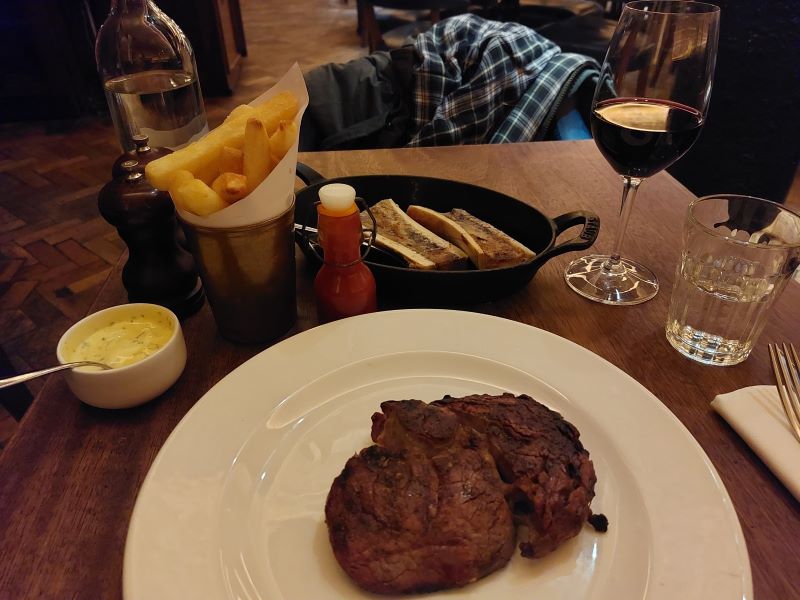 Eftersom jag upptäckt att menyn var full av goda sidorätter så beställde jag inte någon förrätt men det finns flera goda i form av krabba från Devon och annat gott. Till sidorätterna hör även de grönsaker man kan tänkas vilja ha till sin mat. Faktum är att jag inte beställde in en enda sådan utan min tallrik såg ut som om den tillhörde en veganföraktande vit man i äldre medelåldern men eftersom jag var här för köttet och ville gå all in på den typen av upplevelse så kände jag inte att sju pund för lite spenat eller champinjoner behövdes. Jag ville nämligen lägga de pengarna på grillad benmärg. Det blev en riktig höjdare!