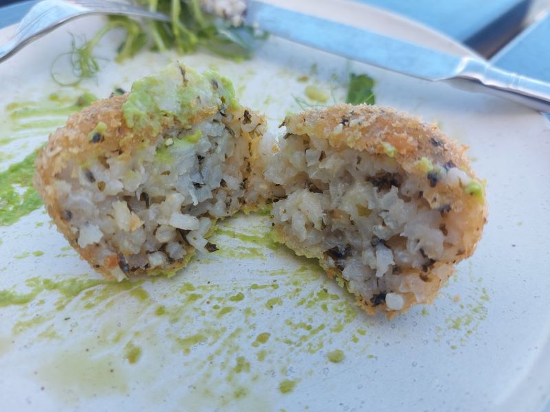 De nuvarande ägarna tog över 2022 och har gått in för att visa upp walesisk matkultur och visa upp lokala produkter av bra kvalitet och med mindre miljöpåverkan. För mig innebär det att jag hittar walesiska arancini på menyn och jag blir genast nyfiken. Den klassiska sicilianska friterade risbollen har fått en walesisk twist genom att den innehåller laverbread, den typ av alg som är populär i Wales. Det är väldigt gott utan att algerna alls tar över. Det drar lite åt det japanska hållet men med en mer dämpad, europeisk smakbild. Vackert är det också med en grön ärtdressing som matchar.