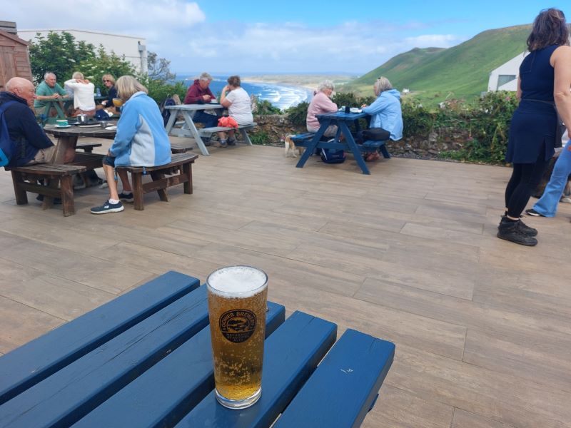 Utomhus på terrassen samlas de flesta så länge det inte blåser alldeles för mycket där uppe. Där sitter du nära naturen och ser ut över stranden och kullarna och jag slår mig ner med en pint Gower Gold från lokala Gower Brewery som visar sig vara en riktigt god, ljus ale.