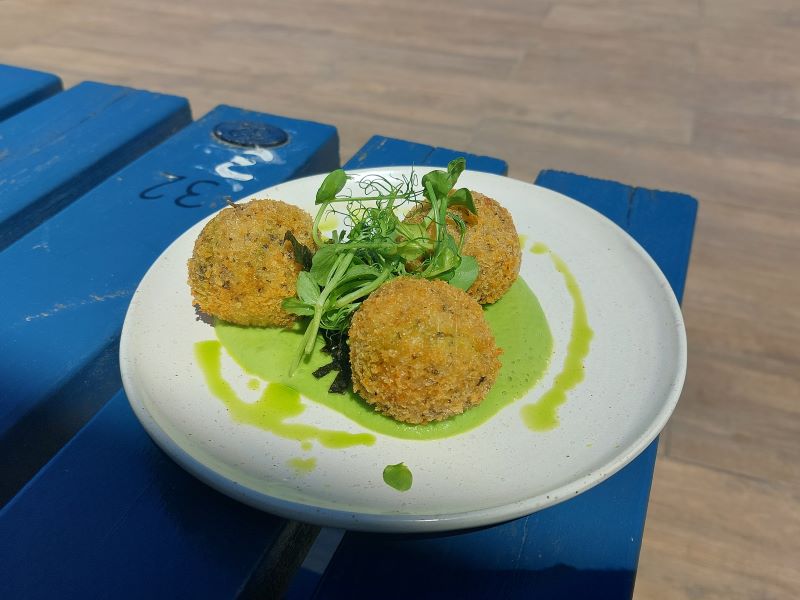 De nuvarande ägarna tog över 2022 och har gått in för att visa upp walesisk matkultur och visa upp lokala produkter av bra kvalitet och med mindre miljöpåverkan. För mig innebär det att jag hittar walesiska arancini på menyn och jag blir genast nyfiken. Den klassiska sicilianska friterade risbollen har fått en walesisk twist genom att den innehåller laverbread, den typ av alg som är populär i Wales. Det är väldigt gott utan att algerna alls tar över. Det drar lite åt det japanska hållet men med en mer dämpad, europeisk smakbild. Vackert är det också med en grön ärtdressing som matchar.