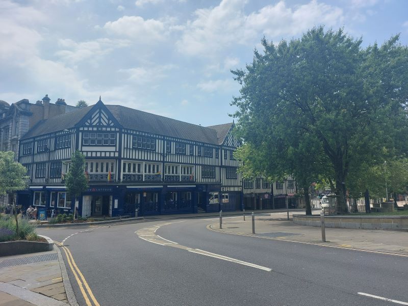 Om du istället vill fortsätta in i stadskärnan med sina butiker så tar du höger och korsar torget vid det stora korsvirkeshuset. Både torget och det som följer är en betongdjungel full av köpcentra och detta beror på att staden bombades under tre februaridagar 1941 på grund av sin industrihistoria och hamnen. Hela dagens torg var bebyggt med Ben Evans gigantiska varuhus i ett pampigt, vackert hus från 1894 innan kriget men lämnades öppet efteråt och är sedan 1990-talet en mötesplats.