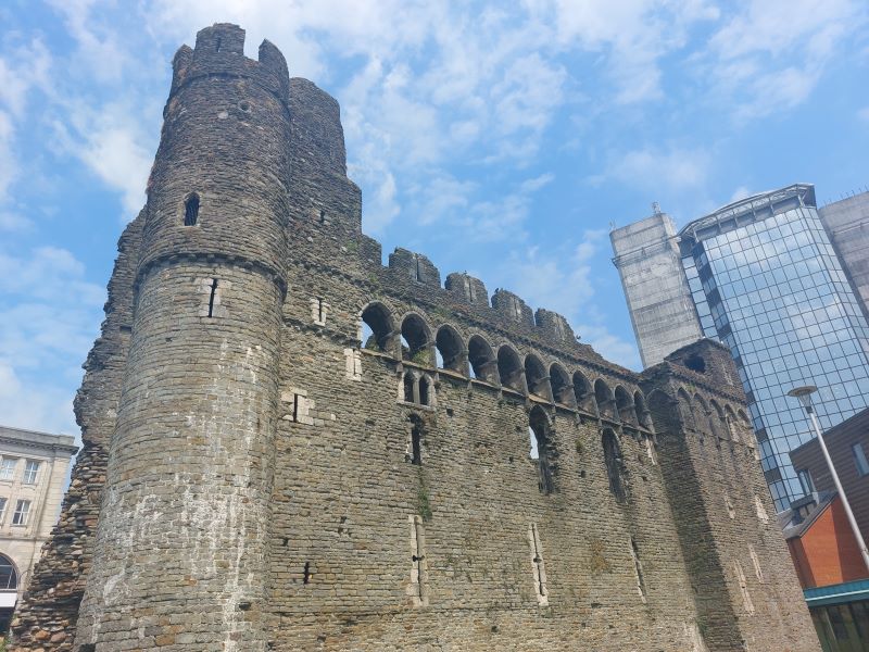 Om du som jag tar tåget till Swansea så släntrar du ner för en låg men lång backe ner mot centrum och ditt första intryck är kanske just ett av nattklubbar och små servicebutiker. Snart kommer du ner till slottsruinen som ligger mitt bland en massa betydligt modernare kvarter. Några väggar är vad som står kvar av slottet från 12- och 1300-talet av vilka den södra väggen på bilden nedan är den mest intressanta. Här har funnits en borg sedan Henry de Beaumonts dagar tidigt 1100-tal för läget är strategiskt på en höjd över floden Tawe men på grund av den moderna utvecklingen ser du inte den vyn idag. Från 1400-talet började slottet minska i betydelse och har varit en ruin sedan 1600-talet. Helt utan drama har det inte varit. William de Braose III, Lord of Gower (vars fru Maud/Matilda är nästan lika känd) anklagades på 1290-talet först för att ha bråkat med både kung och biskop och senare för att utnyttja folket i sitt lokala distrikt Gower men han förbättrade sig och efter förhör 1306 kom The Swansea Charter med viktiga beskrivningar av stadens regler. Det är från den tiden man först hör om kolgruvor i trakten.