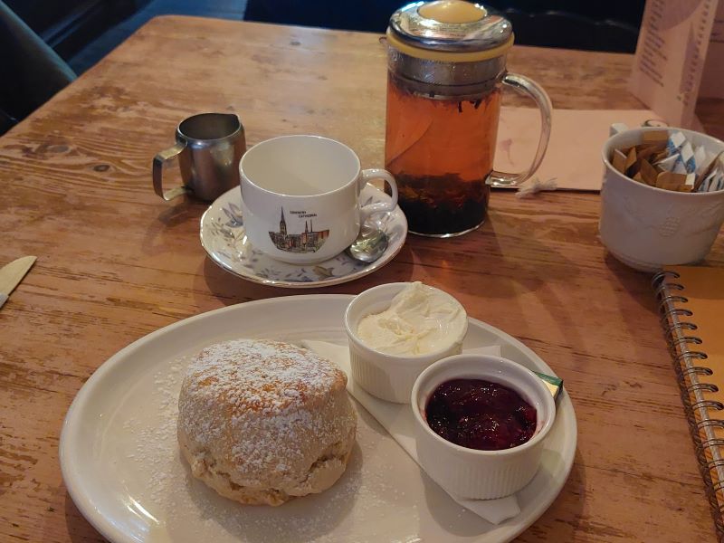 Jag beställer te och scones och sätter mig tillrätta och minsann om jag inte hittar en laddare till telefonen också. Perfekt för mig som varit ute några timmar och fotograferat. Där sitter jag sedan med en kanna min man skulle gillat och en udda kopp med Coventry Cathedral på. Perfekt. Téet är varmt och gott och sconesen på det här etablissemanget går det inte att klaga på även om de inte är nybakade.