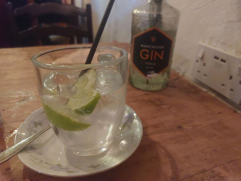 Jag sitter och tjuvlyssnar på människorna runt mig. Akademiska kulturmänniskor i halsduk, mammor med barn och hundar och ungdomar i diverse hårfärger om vartannat. Underbar stämning. Jag skriver och skriver och skriver…till slut har jag druckit upp mitt te och eftersom jag har blivit varm och torkat så beställer jag in en gin och tonic så att jag får en ursäkt att stanna lite till. Det här känns precis som i ungdomen när vi satt på Göteborgs caféer på håltimmar och kvällar fast jag har mer pengar till gin idag och slipper återvinna tepåsen. Man får sitta länge här känner jag. Det är Manchester Gin som jag aldrig provat och den blir ingen favorit men är fortfarande jättegod, bara inte så unik. Massor av is precis som det ska vara och så ett otippat glas.