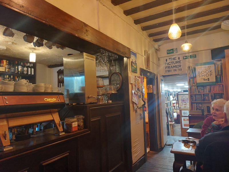 Det är nästan fullt därinne men jag har tur och får ett bord långt in. Perfekt för jag upptäcker nu att jag sitter och ser in det antikvariat som gömmer sig längst bak. En italiensk espressomaskin också. Det här är ju precis den pärla det utmålats som inser jag.