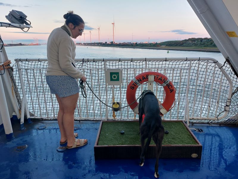 Har du hunden i hytten kan ni njuta ihop även om de flesta djurhytter är utan fönster men tar du nattfärjan sover du ju det mesta av resan ändå om du har hunden med och inte sitter i baren. En tur ut på däck innan sovstunden förvirrar förstagångshunden som inte alls begriper vad den gröna mattan är till för även om den luktar väldigt av andra hundar. Det är litet och oinspirerande men där finns en vattenslang att använda så det är så rent det kan vara mellan storstädningarna för den korta stund man är där.