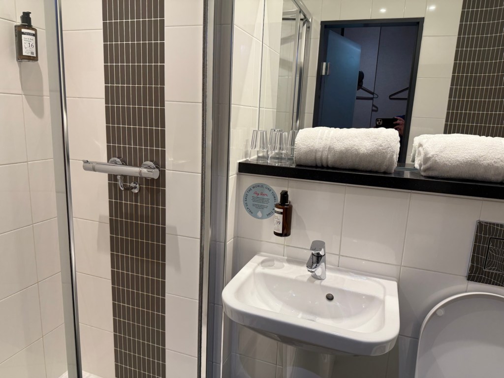 Rummet var pyttelitet men det dög åt oss. Allt gick i hotellets gulsvarta färger. Sängen var inte lika stor som på Premier Inn men större än de queen size man ofta hittar på oberoende småhotell. Vi sov bra med skönt täcke. Även badrummet var litet men fräscht och hade det man behöver.
