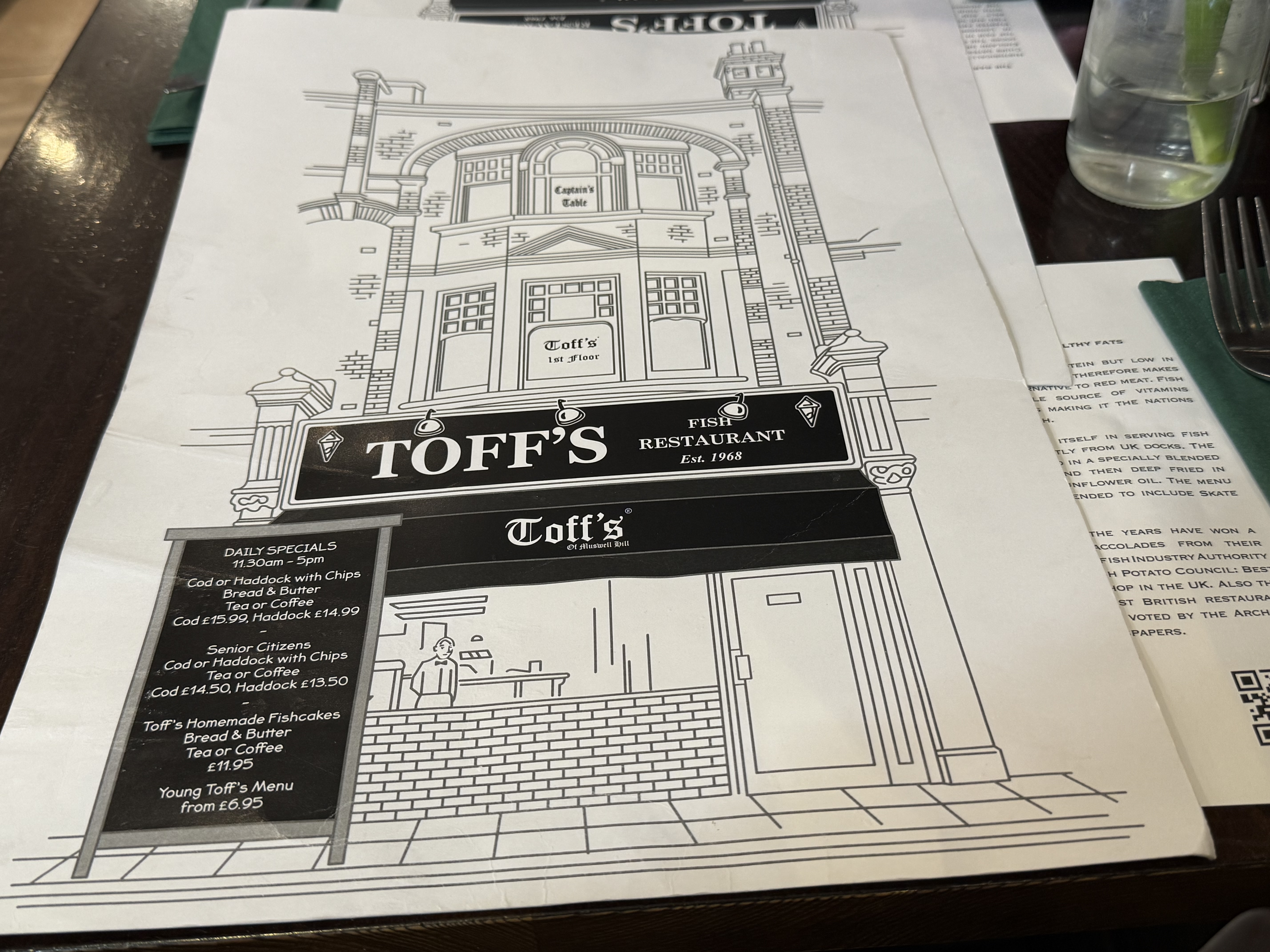 Det här är som så ofta en familjerestaurang. Inte minst i norra London är det ofta invandrade greker som driver bra så kallade ”chippies” och Toffs är inget undantag. Här finns allt det klassiska britter förväntar sig i form av vitt bröd och annat vid sidan om.