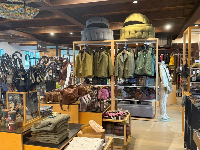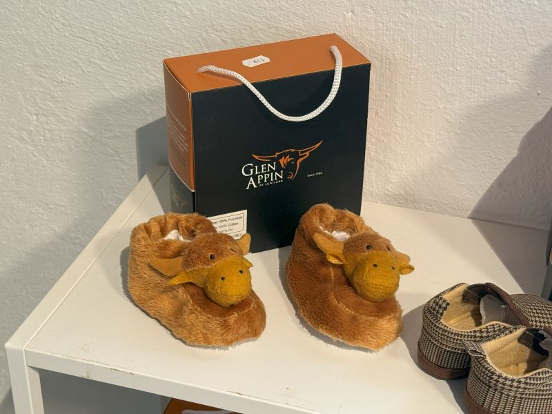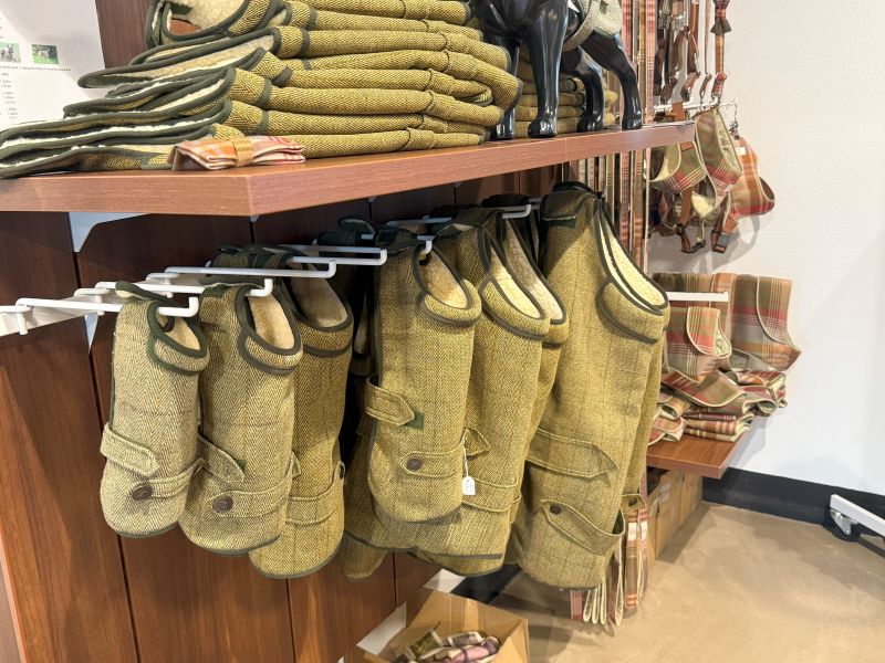 Det är naturligtvis inte bara hundar som ska ha kläder här utan även vi människor och här finns precis allt det där som får dig att se ut som en antikhandlare från Helmsley och mer därtill. För min del blev det en keps i grönt. En hel del herrskjortor och fina kängor men naturligtvis också mängder av tweed. Barnen lämnas heller inte utan ekipering. Barntofflorna med Highland Cows var något i en alldeles egen klass.