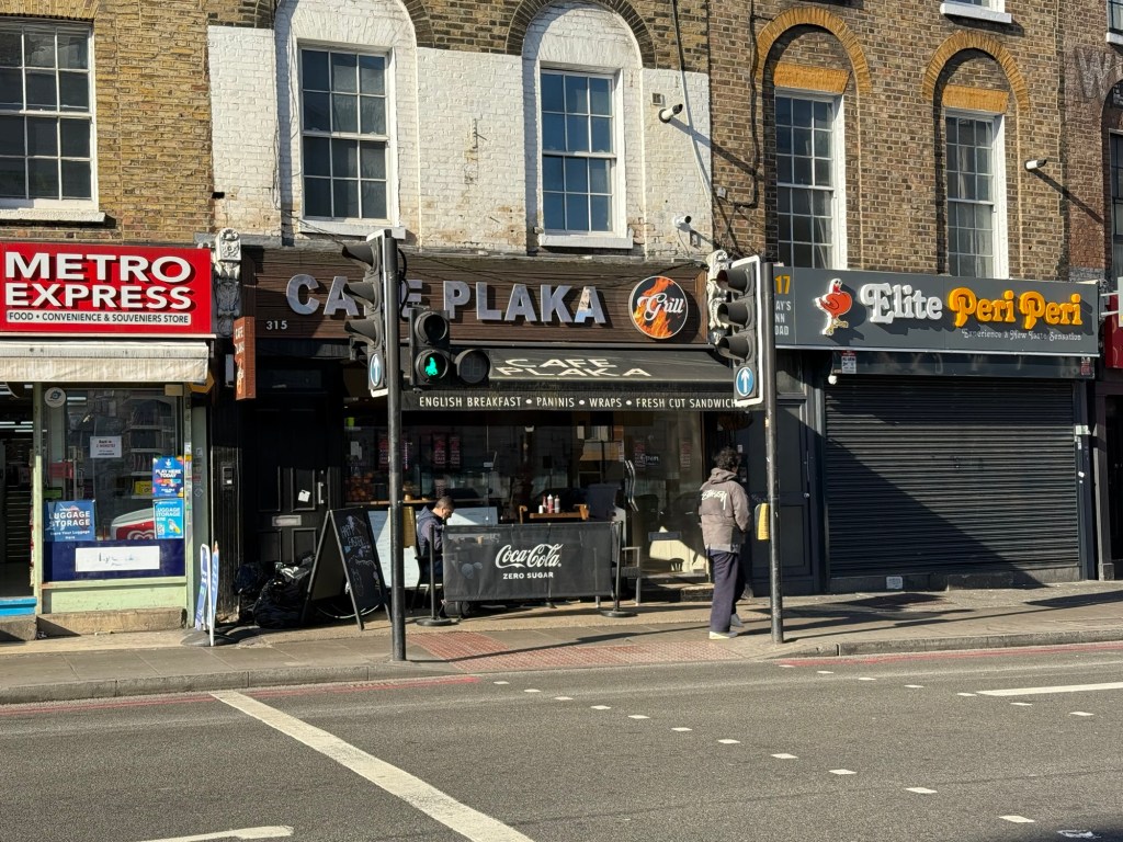 Café Plaka ligger just i den hektiska korsning där Euston Road tar slut och Grays Inn Road börjat, perfekt för den som kommit till St Pancras eller King’s Cross. Utifrån ser stället ut som det gjort ett bra tag och jag tror att ägarna är greker fortfarande. Det har iallafall behållit sitt inarbetade namn och har en och annan grekisk specialitet.