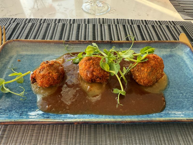 När vi installerat oss gick vi ner för att äta vår middag. Jag hade verkligen inte förväntat mig några stordåd av ett nyrenoverat litet hotell i Oban och tyckte därför att den var helt okej. Vår bokning inkluderade trerätters där vi hade att välja mellan fyra förrätter, fyra varmrätter (båda med ett vegetariskt alternativ) och ett par desserter. Medan dottern valde dagens soppa till förrätt och var nöjd med den så valde jag haggis bon bons för det äter man ju inte varje dag hemma och det var faktiskt det bästa av allt. Till varmrätt blev det kyckling med pepparsås för dottern och jag tog skotsk lax med skaldjursrisotto där det kunde varit betydligt mer tryck i skaldjuren och laxen var något torr men det var ju nu inget lyxhotell och det är svårt att få säsongsarbetare i köket redan till påsk efter Brexit i småstäder långt bort så jag var nöjd. Desserten däremot var mer av en besvikelse eftersom jag älskar sticky toffee pudding och den här kom helt utan vanilj, varken som glass eller sås även om den var god i sig.