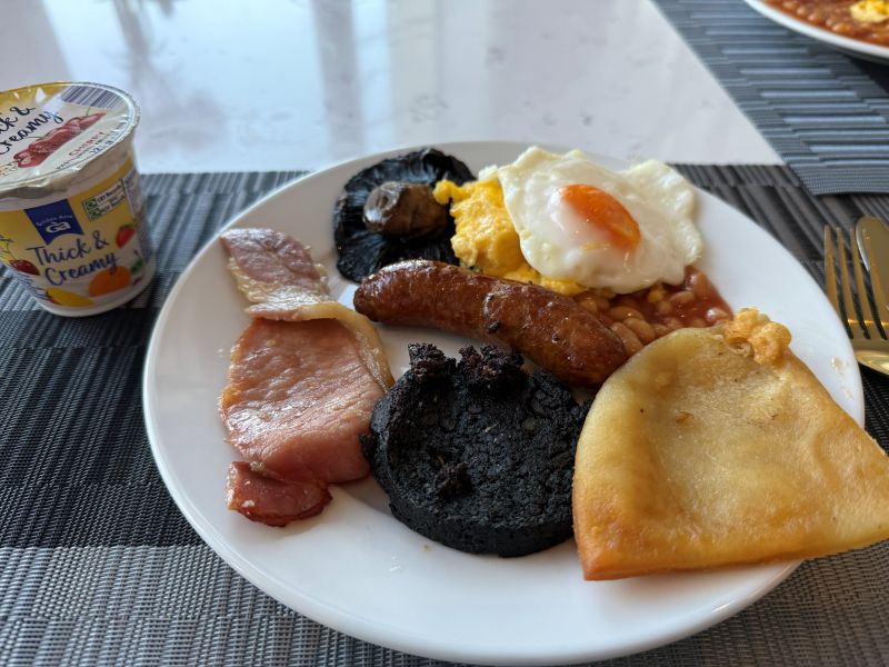 Frukosten hade både kall buffé och varma rätter att beställa och serverades i restaurangen. Det var inget upphetsande på buffén och en dag var croissanterna nästan brända, det var nog det där med personalbrist som spökade för vi såg inte många i köket. Där fanns det man tror att kontinentala gäster gillar i form sv ostskivor och salami men också yoghurt samt skotska tattie scones av potatis och mer likt pannkaka än scones (jag är ingen fan och de här var mest torra i kanterna). Det varma inkluderade det du förväntar dig av en Full Scottish samt lax med äggröra och liknande äggrätter och var gott.